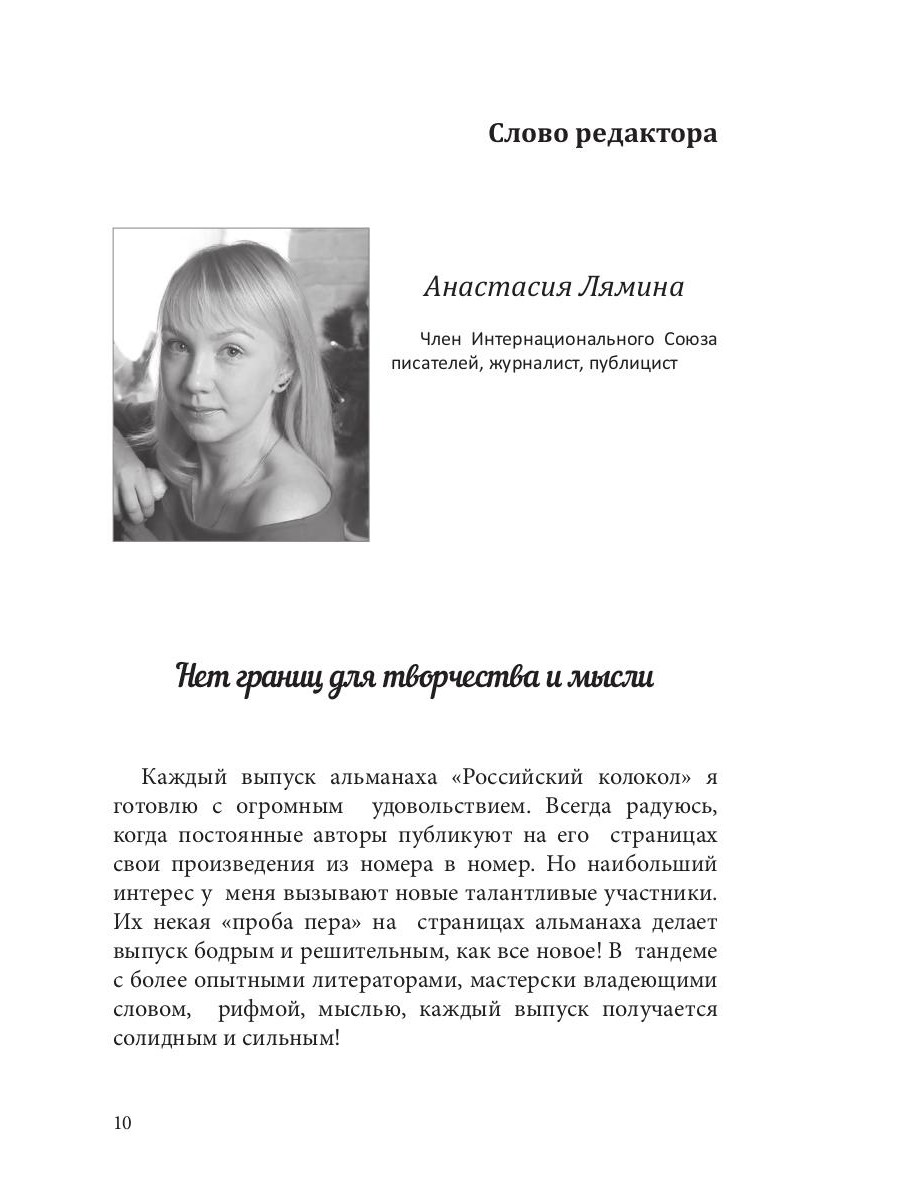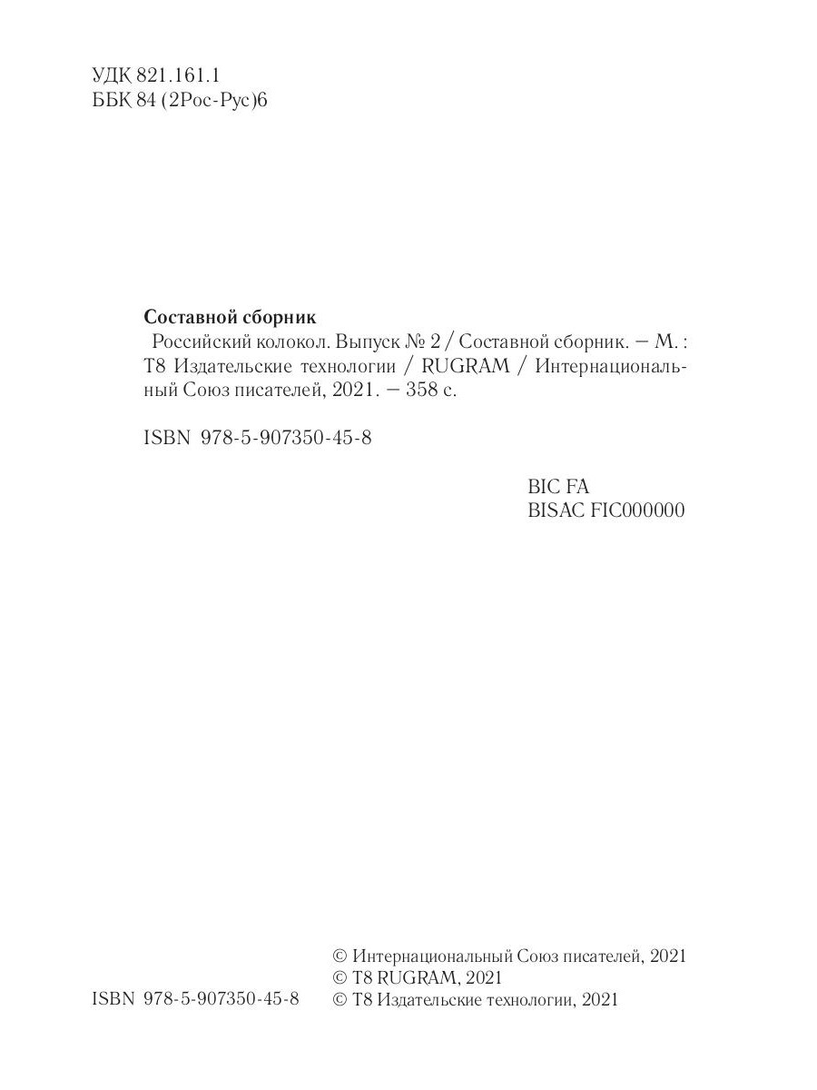 Каждый выпуск альманаха «Российский колокол» я готовлю с огромным удовольствием. Всегда радуюсь, когда постоянные авторы публикуют на его страницах свои произведения из номера в номер. Но наибольший интерес у меня вызывают новые талантливые участники. Их некая «проба пера» на страницах альманаха делает выпуск бодрым и решительным, как все новое! В тандеме с более опытными литераторами, мастерски владеющими словом, рифмой, мыслью, каждый выпуск получается солидным и сильным! А какая география талантов в альманахе «Российский колокол»! От Дальнего Востока до Калининграда, от северных берегов страны до ее южных границ. Да что там границы России. Каждый номер мы стираем их и выходим за пределы: отправляемся в творческое путешествие и находим русскоязычных авторов за рубежом. И нам приятно, что наше издание всех авторов сплачивает и вдохновляет. Ведь всех объединяет любовь к литературе, творчеству, русскому языку! Приятного чтения.| Издательство | Т8 RUGRAM |