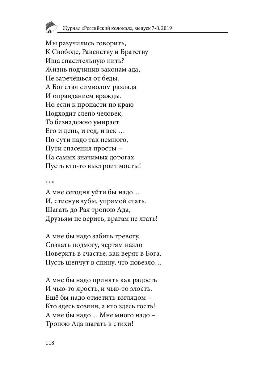 Вот уже 25 лет «Российский колокол» являет собой своеобразную выставку достижений литературы современности. Авторы, с которыми вы встречаетесь в нашем издании, это не только люди знаменитые, как говорят - «из первых рядов современной литературы». Кстати, с ними мы всегда знакомим читателей в постоянных рубриках «Современная проза», «Литература зарубежья», «Критика». Но есть на страницах «Российского колокола» достойное место и для авторов, которые только набирают литературный вес и опыт, однако, весьма уверенно взбираются на творческий Олимп! С их творчеством вы можете познакомиться в рубриках «Литературная гостиная» и «Голоса провинции».