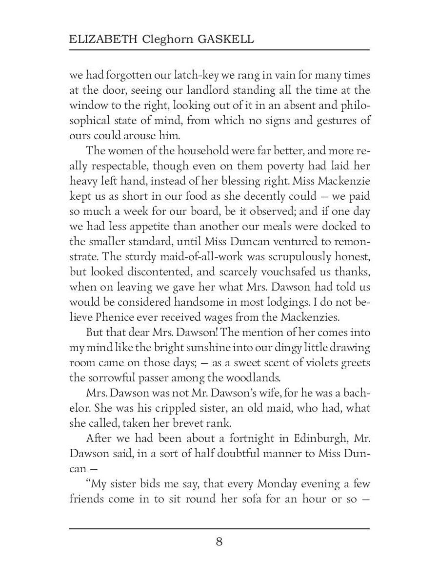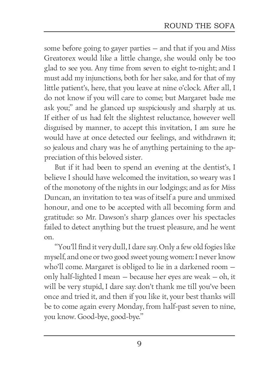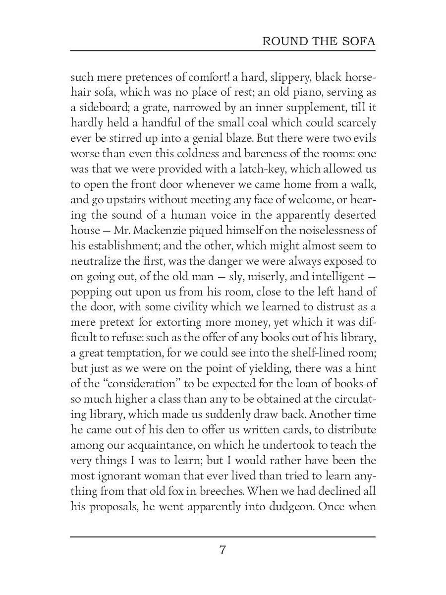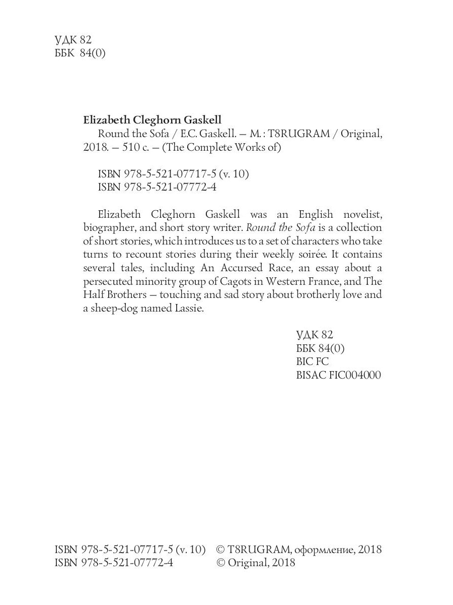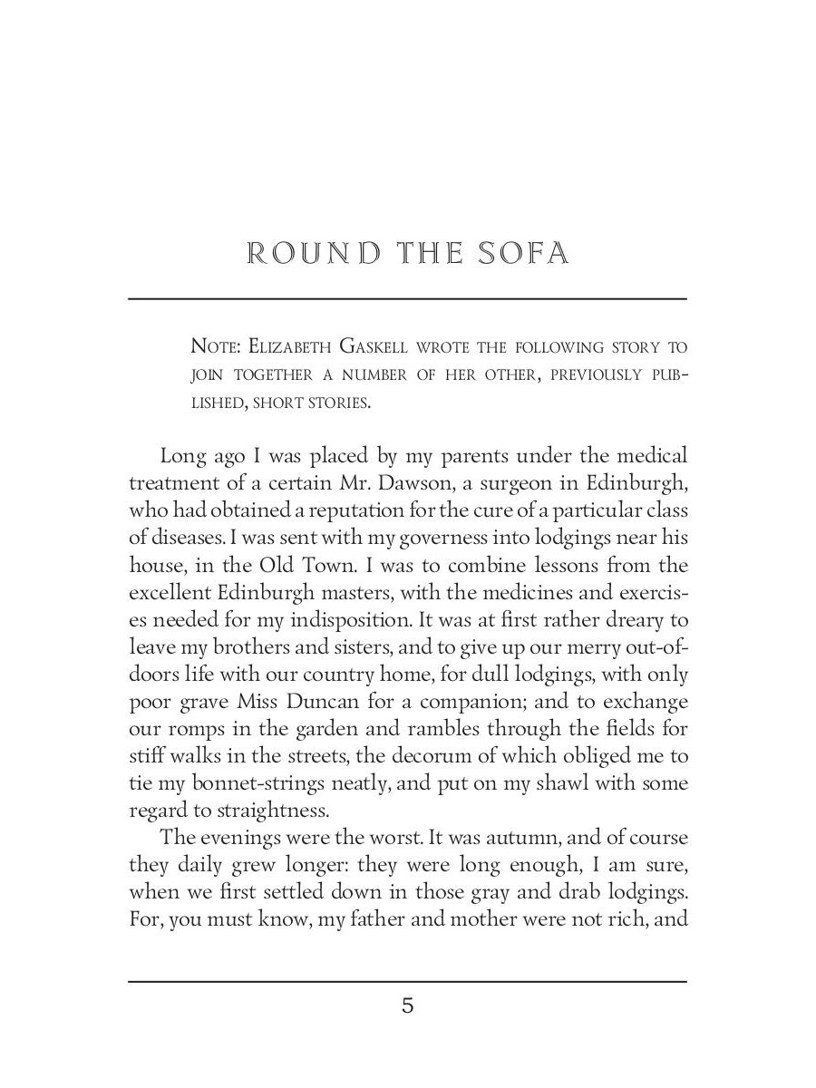Elizabeth Cleghorn Gaskell was an English novelist, biographer, and short story writer. Round the Sofa is a collection of short stories, which introduces us to a set of characters who take turns to recount stories during their weekly soiree. It contains several tales, including An Accursed Race, an essay about a persecuted minority group of Cagots in Western France, and The Half Brothers - touching and sad story about brotherly love and a sheep-dog named Lassie.