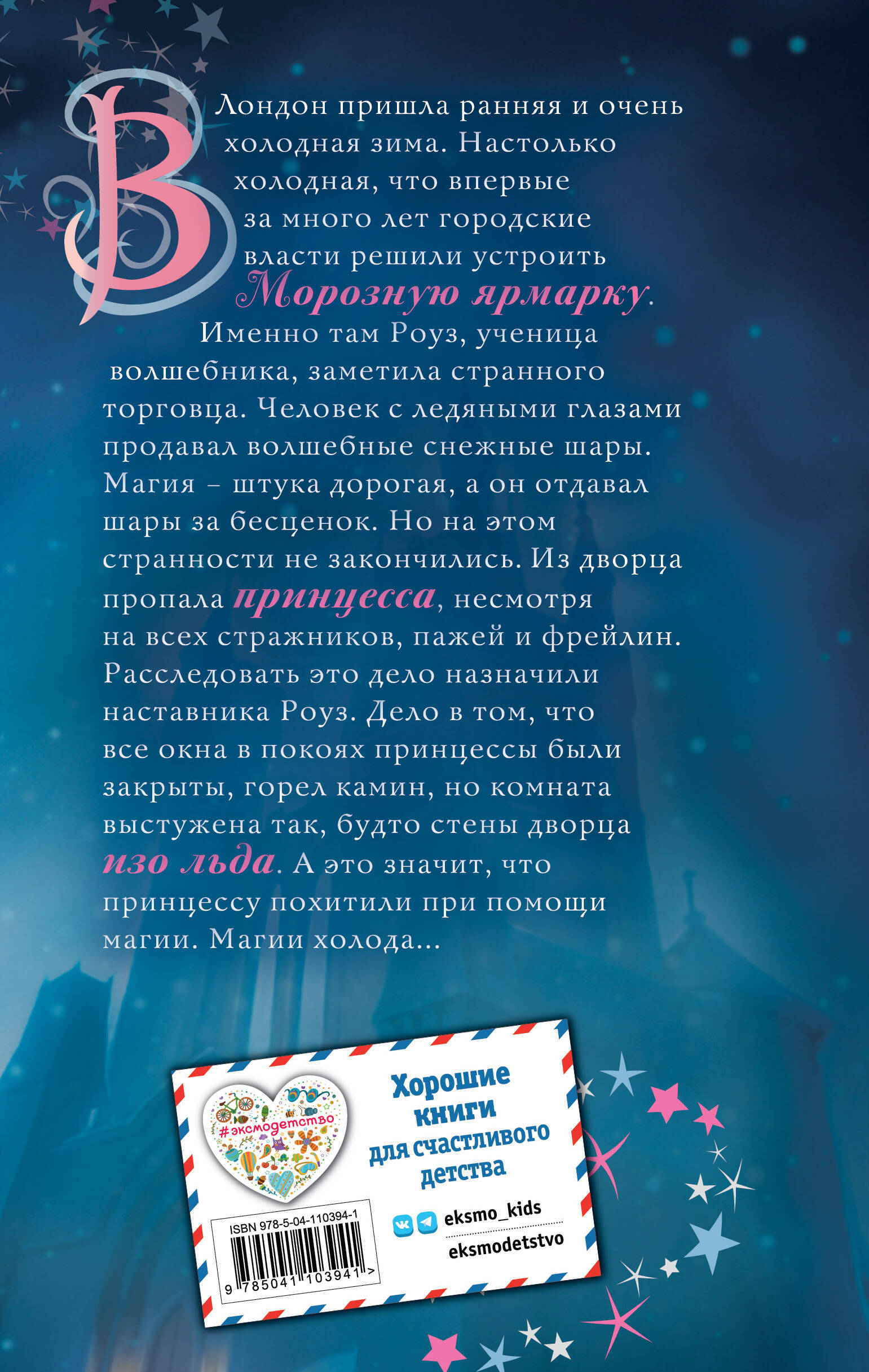 В Лондон пришла ранняя и очень холодная зима. Настолько холодная, что впервые за много лет городские власти решили устроить Морозную ярмарку. Именно там Роуз, ученица волшебника, заметила странного торговца. Человек с ледяными глазами продавал волшебные снежные шары. Магия - штука очень и очень дорогая, а он отдавал шары за бесценок, а то и просто дарил. Но на этом неприятности и странности не закончились. Из дворца пропала принцесса, несмотря на всех стражников, пажей и фрейлин. Расследовать это дело назначили наставника Роуз, королевского алхимика. Дело в том, что все окна в покоях принцессы были закрыты, горел камин, но комната выстужена так, будто стены дворца изо льда. А это значит, что принцессу похитили при помощи магии. Магии холода... История про самостоятельную, рассудительную, храбрую и отзывчивую девочку Роуз, которая может служить замечательным примером и научить читательниц верить в себя. Серия одного из самых любимых у детей и популярных в России авторов - Холли Вебб!| Издательство | ООО "Издательство "Эксмо" |