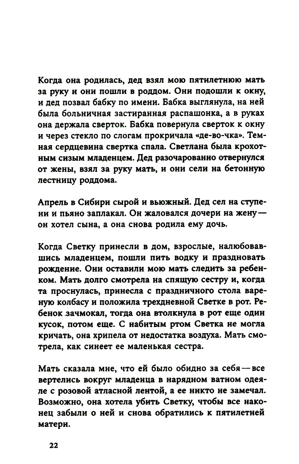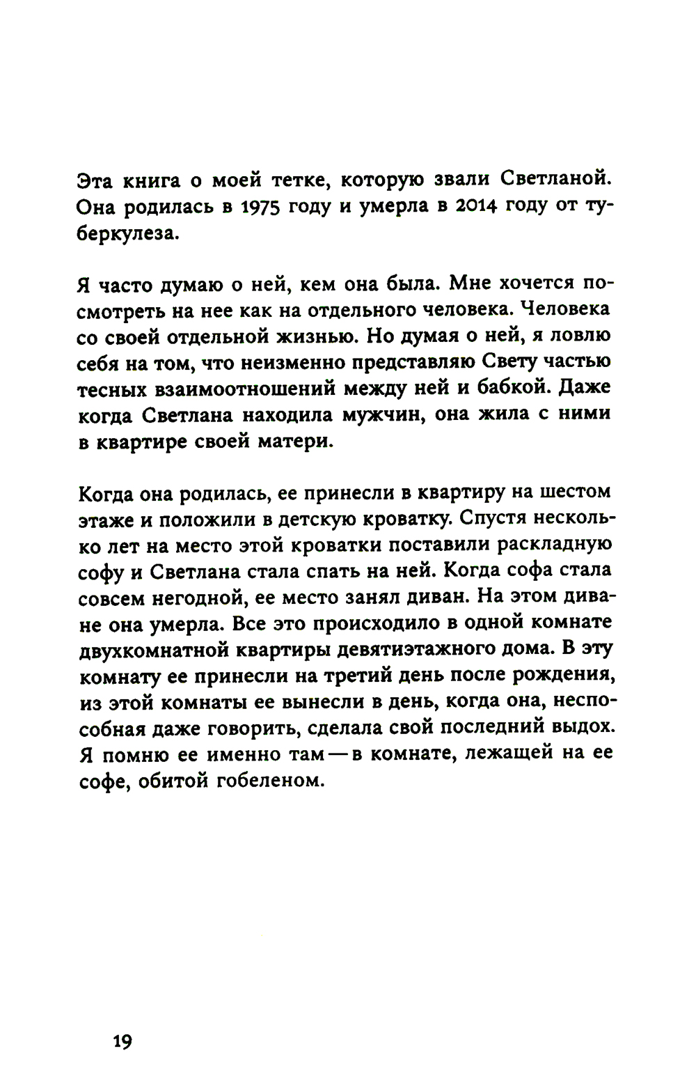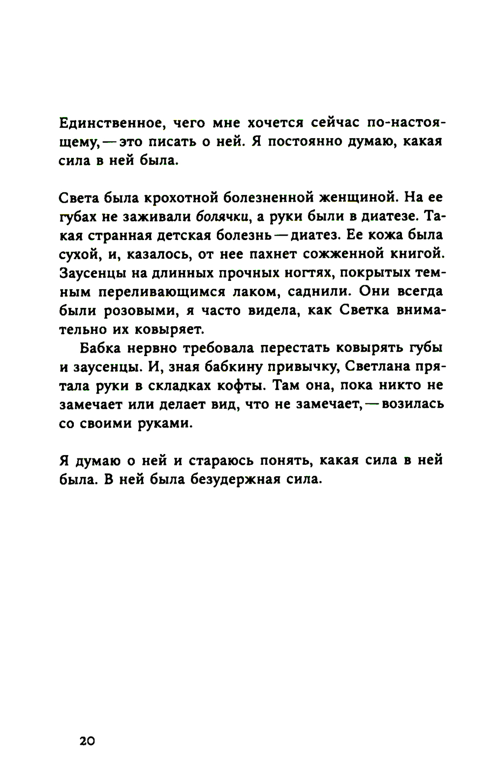 «Иногда я спрашиваю у себя, почему для письма мне нужна фигура извне: мать, отец, Светлана. Почему я не могу написать о себе? Потому что я - это основа отражающей поверхности зеркала. Металлическое напыление. Можно долго всматриваться в изнаночную сторону зеркала и ничего не увидеть, кроме мелкой поблескивающей пыли. Я отражаю реальность». Автофикшн-трилогию, начатую книгами «Рана» и «Степь», Оксана Васякина завершает романом, в котором пытается разгадать тайну короткой, почти невесомой жизни своей тети Светланы. Из небольших фрагментов памяти складывается сложный образ, в котором тяжелые отношения с матерью, бытовая неустроенность и равнодушие к собственной судьбе соседствуют с почти детской уязвимостью и чистотой. Но чем дальше героиня погружается в рассказ о Светлане, тем сильнее она осознает неразрывную связь с ней и тем больше узнает о себе и природе своего письма. Оксана Васякина - писательница, лауреатка премий «Лицей» (2019) и «НОС» (2021).| Издательство | Новое литературное обозрение |