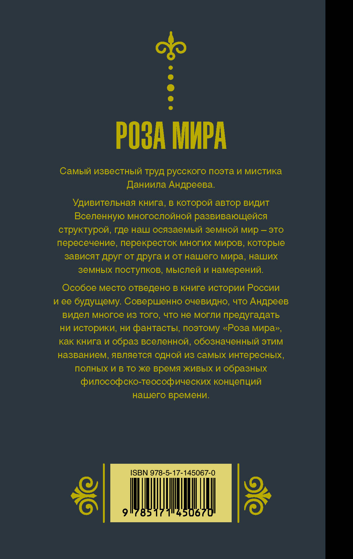 Самый известный труд русского поэта и мистика Даниила Андреева. Удивительная книга, в которой автор видит Вселенную многослойной развивающейся структурой, где наш осязаемый земной мир - это пересечение, перекресток многих миров, которые зависят друг от друга и от нашего мира, наших земных поступков, мыслей и намерений. Особое место отведено в книге истории России и ее будущему. Совершенно очевидно, что Андреев видел многое то, чего не могли предугадать ни историки, ни фантасты, поэтому «Роза мира», как книга и образ вселенной, обозначенный этим названием, является одной из самых интересных, полных и в то же время живых и образных философско-теософических концепций нашего Времени.| Издательство | ИЗДАТЕЛЬСТВО "АСТ" |