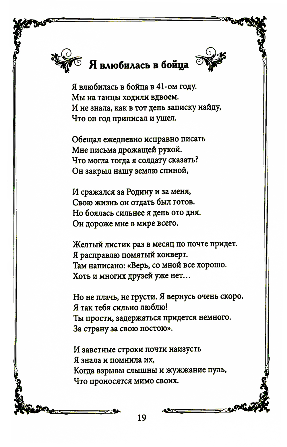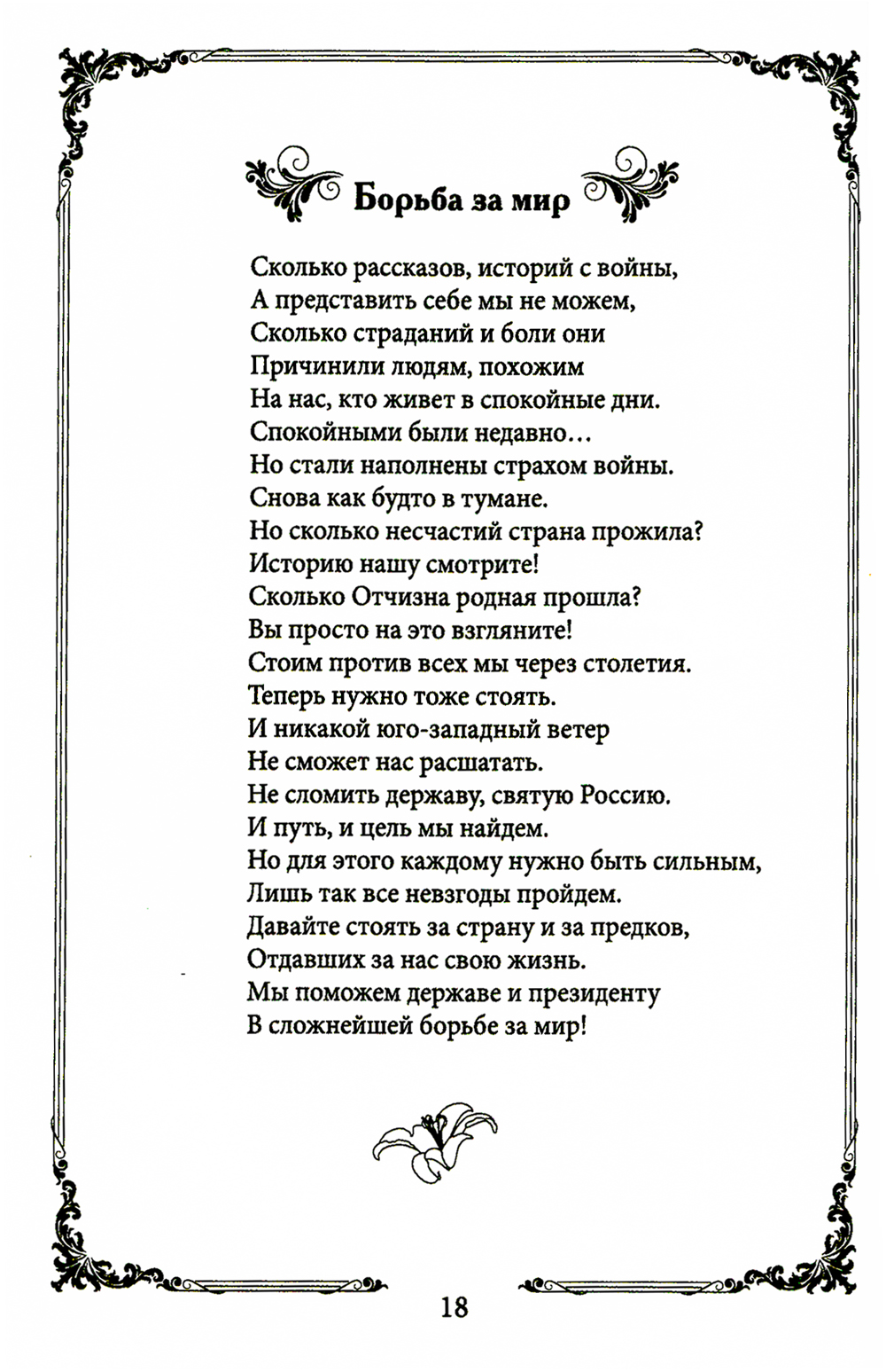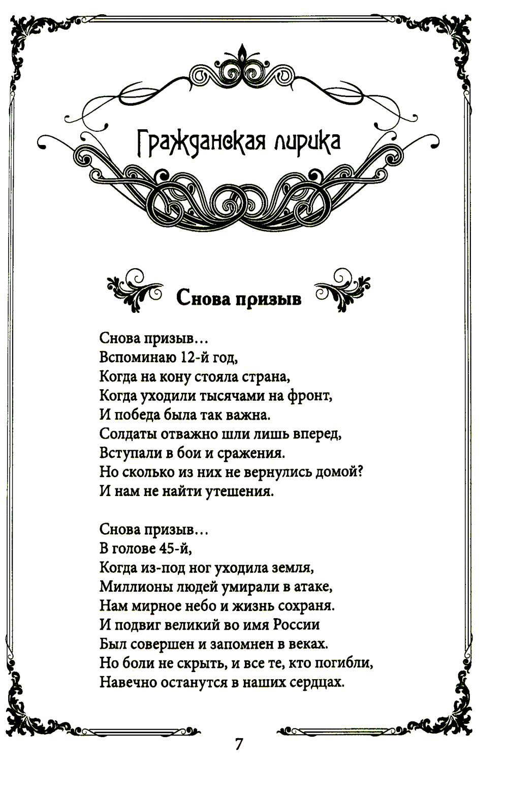 В новом сборнике поэтессы Насти Авети собраны по словам автора, «уже более осознанные произведения, и такими они будут становиться с каждым разом». Не удивительно, что целый цикл поэтесса посвятила гражданской лирике. Немало видела я фотографий, Рассматривала кадры старых лет, Где будучи еще простым солдатом, Мне улыбается герой - мой дед. Или: Война. Самое тяжелое слово. Страшна. Без сожаления убьет любого. Ноя Верна и люблю Отчизну. Когда Будет нужно, за Родину погибну. Впрочем, тематика стихотворений - самая разная. Ведь не зря же Настя признается: Начинающий поэт - Это музы кладовая. Действительно, невозможно, чтобы из всех стихотворений ни одно не нашло малейшего отклика в душе, ведь творчество и искусство - это про жизнь, про всех людей в целом и про каждого из нас в отдельности, Настя Авети предлагает читателям взглянуть на мир ее глазами...| Издательство | Родина |