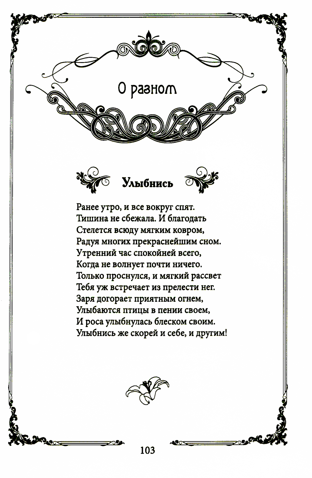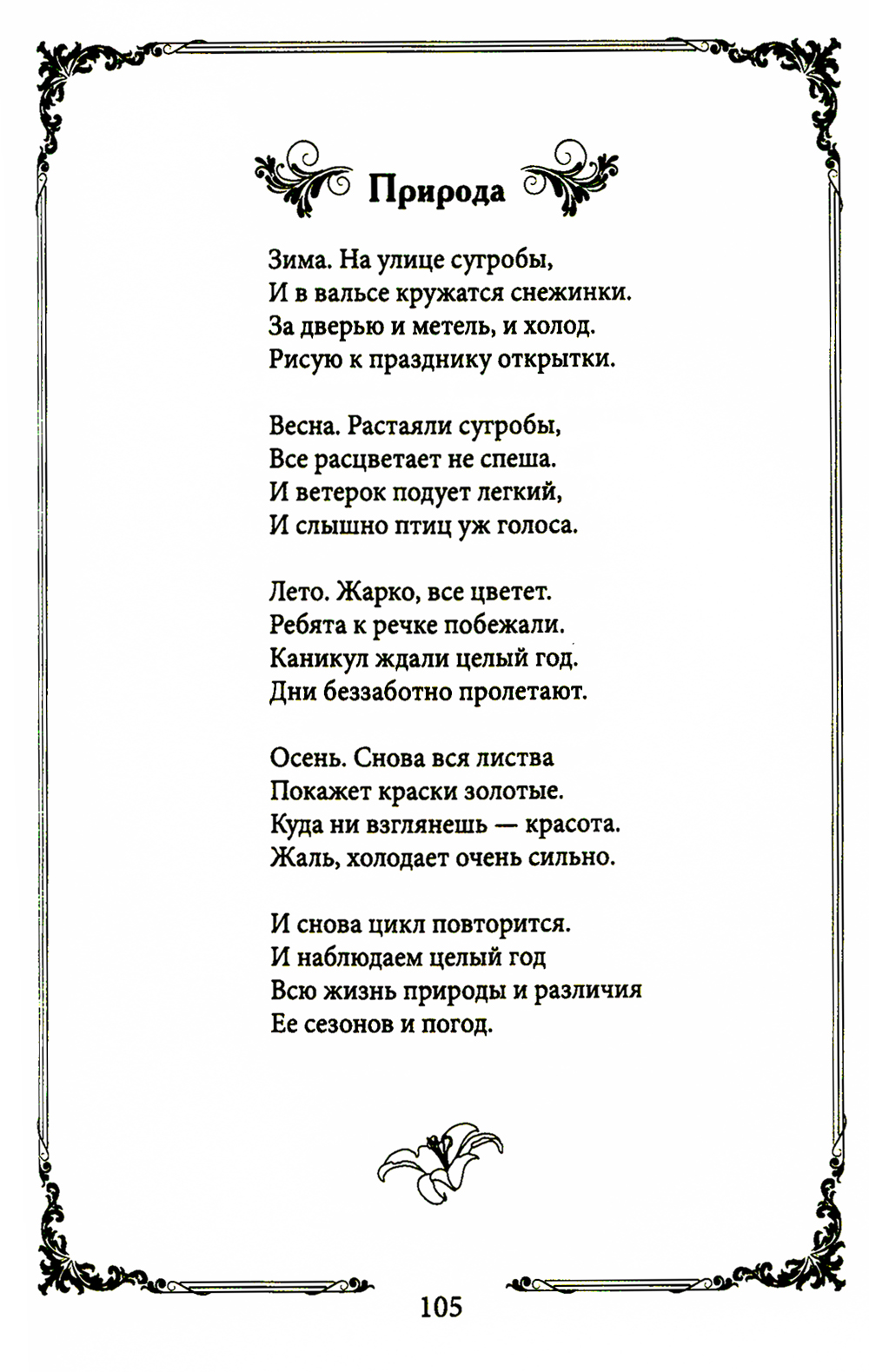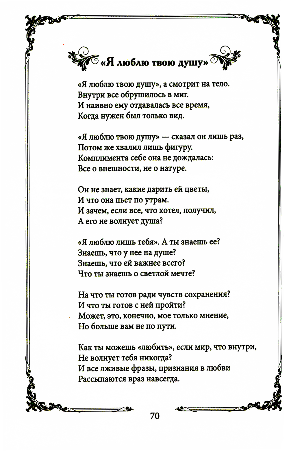 В новом сборнике поэтессы Насти Авети собраны по словам автора, «уже более осознанные произведения, и такими они будут становиться с каждым разом». Не удивительно, что целый цикл поэтесса посвятила гражданской лирике. Немало видела я фотографий, Рассматривала кадры старых лет, Где будучи еще простым солдатом, Мне улыбается герой - мой дед. Или: Война. Самое тяжелое слово. Страшна. Без сожаления убьет любого. Ноя Верна и люблю Отчизну. Когда Будет нужно, за Родину погибну. Впрочем, тематика стихотворений - самая разная. Ведь не зря же Настя признается: Начинающий поэт - Это музы кладовая. Действительно, невозможно, чтобы из всех стихотворений ни одно не нашло малейшего отклика в душе, ведь творчество и искусство - это про жизнь, про всех людей в целом и про каждого из нас в отдельности, Настя Авети предлагает читателям взглянуть на мир ее глазами...| Издательство | Родина |