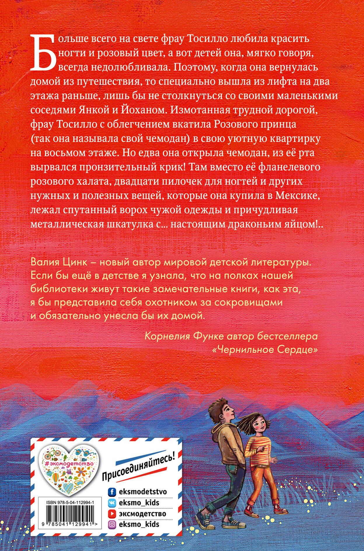 Янка и Йохан не поверили собственным глазам, когда увидели настоящего живого дракончика в квартире своей соседки фрау Тосилло! Но на этом чудеса не кончились… Оказывается, этот дракон ещё и разговаривать умеет, а ещё очень любит есть всё зелёного цвета - например, капусту и шпинат. Фрау Тосилло и дети полюбили Курмо (так назвали дракошу) и очень скоро уже не могли представить свою жизнь без него. Только вот неожиданно выяснилось, что сказочный друг попал к ним совершенно случайно, по досадной ошибке. Оказывается, когда фрау Тосилло возвращалась из Мексики, то сняла с ленты в аэропорту не свой чемодан с драконьим яйцом внутри! Но как же теперь быть? Ведь однажды Курмо придётся вернуть его законным хозяевам… В книге есть всё, что нравится современным подросткам: привлекательные герои, много юмора, хороший сюжет, дракон и компьютерные игры. Очень красивое оформление! Чешуйки дракончика и название на обложке оформлены золотой фольгой. Не пропустите продолжение истории - «Курмо загадывает желание»!| Издательство | ООО "Издательство "Эксмо" |