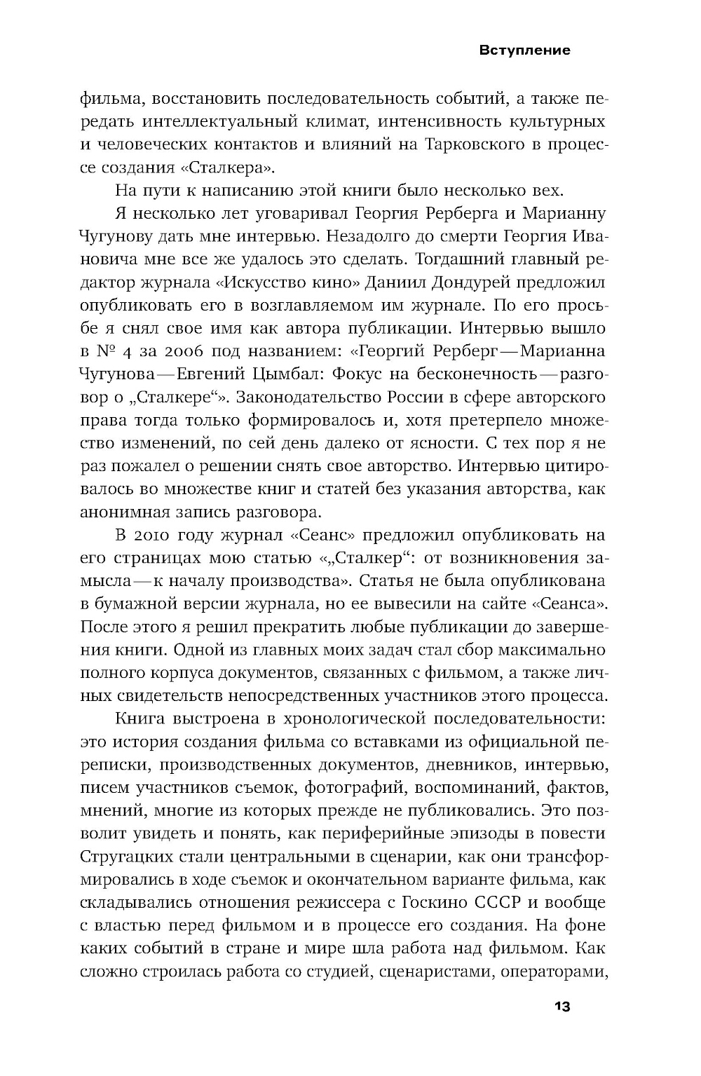 Художественный фильм «Сталкер» Андрея Тарковского по повести братьев Стругацких «Пикник на обочине» - ключевой памятник позднесоветской культуры, получивший всемирное признание. Он не раз становился предметом киноведческих исследований, вдохновлял художников и режиссеров, а о работе над фильмом писали многие, кто был рядом с Тарковским на разных этапах непростого пути от замысла проекта до его воплощения. Режиссер, актер и писатель Евгений Цымбал более двух лет проработал на съемках фильма сначала ассистентом по реквизиту, а затем вторым режиссером. В своей книге он стремится восстановить хронику создания фильма, подкрепляя ее документами и личными свидетельствами. Читателю предстоит узнать, как первоначальный замысел трансформировался в ходе работы со сценарием, ближе познакомиться с культурно-политическим контекстом, увидеть прямую связь между биографическими обстоятельствами жизни Тарковского и его художественными решениями. Личные воспоминания в книге монтируются с фрагментами интервью, которые автор брал у участников съемочной группы.| Издательство | Новое литературное обозрение |