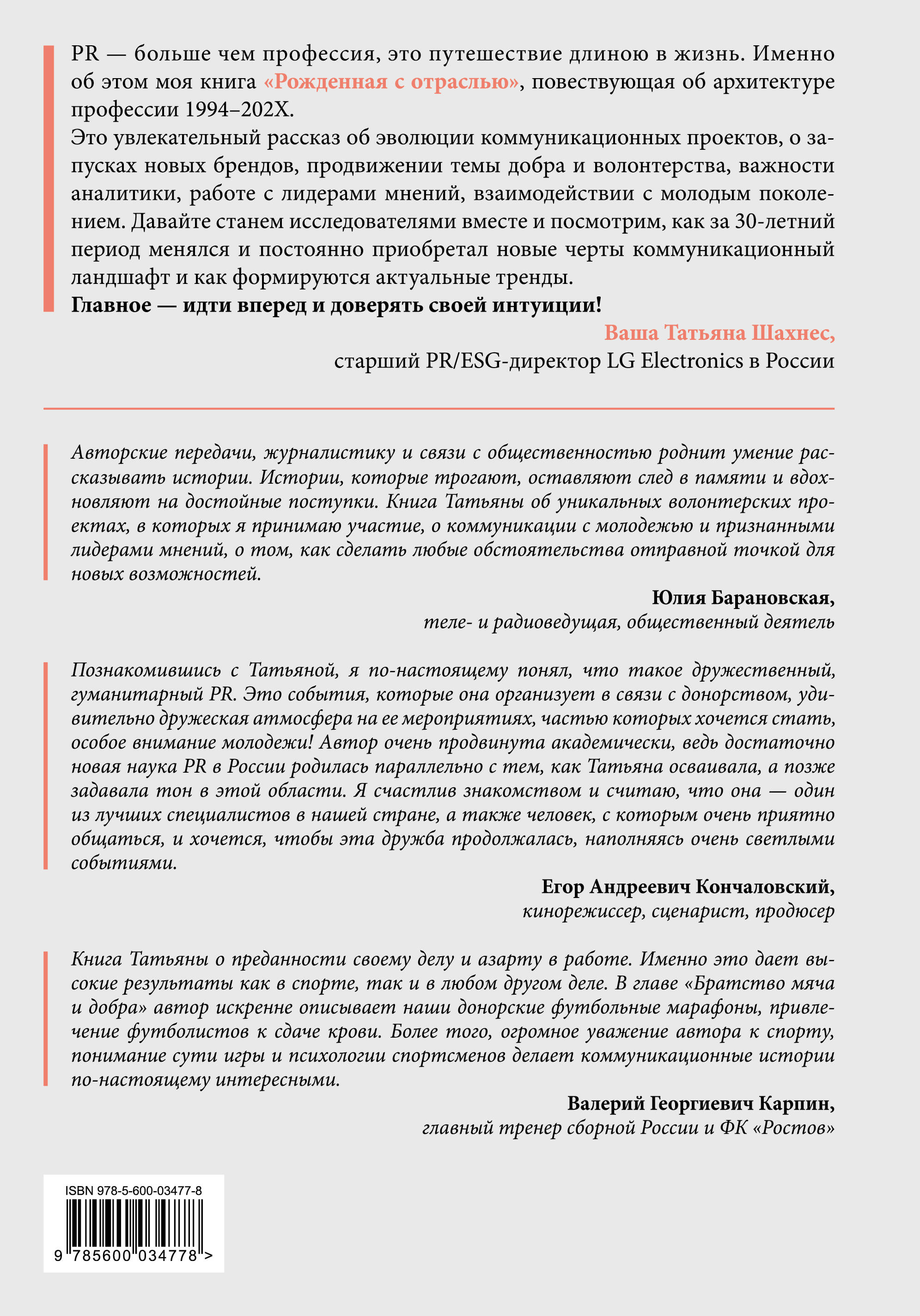 «PR - больше чем профессия, это путешествие длиною в жизнь. Именно об этом моя книга «Рожденная с отраслью», повествующая об архитектуре профессии 1994-202Х. Это увлекательный рассказ об эволюции коммуникационных проектов, о запусках новых брендов, продвижении темы добра и волонтерства, важности аналитики, работе с лидерами мнений, взаимодействии с молодым поколением. Давайте станем исследователями вместе и посмотрим, как за 30-летний период менялся и постоянно приобретал новые черты коммуникационный ландшафт и как формируются актуальные тренды. Главное - идти вперед и доверять своей интуиции! Ваша Татьяна Шахнес, старший PR/ESG-директор LG Electronics в России». «Авторские передачи, журналистику и связи с общественностью роднит умение рассказывать истории. Истории, которые трогают, оставляют след в памяти и вдохновляют на достойные поступки. Книга Татьяны об уникальных волонтерских проектах, в которых я принимаю участие, о коммуникации с молодежью и признанными лидерами мнений, о том, как сделать любые обстоятельства отправной точкой для новых возможностей». - Юлия Барановская, теле- и радиоведущая, общественный деятель «Познакомившись с Татьяной, я по-настоящему понял, что такое дружественный, гуманитарный PR. Это события, которые она организует в связи с донорством, удивительно дружеская атмосфера на ее мероприятиях, частью которых хочется стать, особое внимание молодежи! Автор очень продвинута академически, ведь достаточно новая наука PR в России родилась параллельно с тем, как Татьяна осваивала, а позже задавала тон в этой области. Я счастлив знакомством и считаю, что она - один из лучших специалистов в нашей стране, а также человек, с которым очень приятно общаться, и хочется, чтобы эта дружба продолжалась, наполняясь очень светлыми событиями». - Егор Андреевич Кончаловский, кинорежиссер, сценарист, продюсер «Книга Татьяны о преданности своему делу и азарту в работе. Именно это дает высокие результаты как в спорте, так и в любом другом деле. В главе "Братство мяча и добра" автор искренне описывает наши донорские футбольные марафоны, привлечение футболистов к сдаче крови. Более того, огромное уважение автора к спорту, понимание сути игры и психологии спортсменов делает коммуникационные истории по-настоящему интересными». - Валерий Георгиевич Карпин, главный тренер сборной России и ФК «Ростов»| Издательство | ООО "Издательство "Эксмо" |