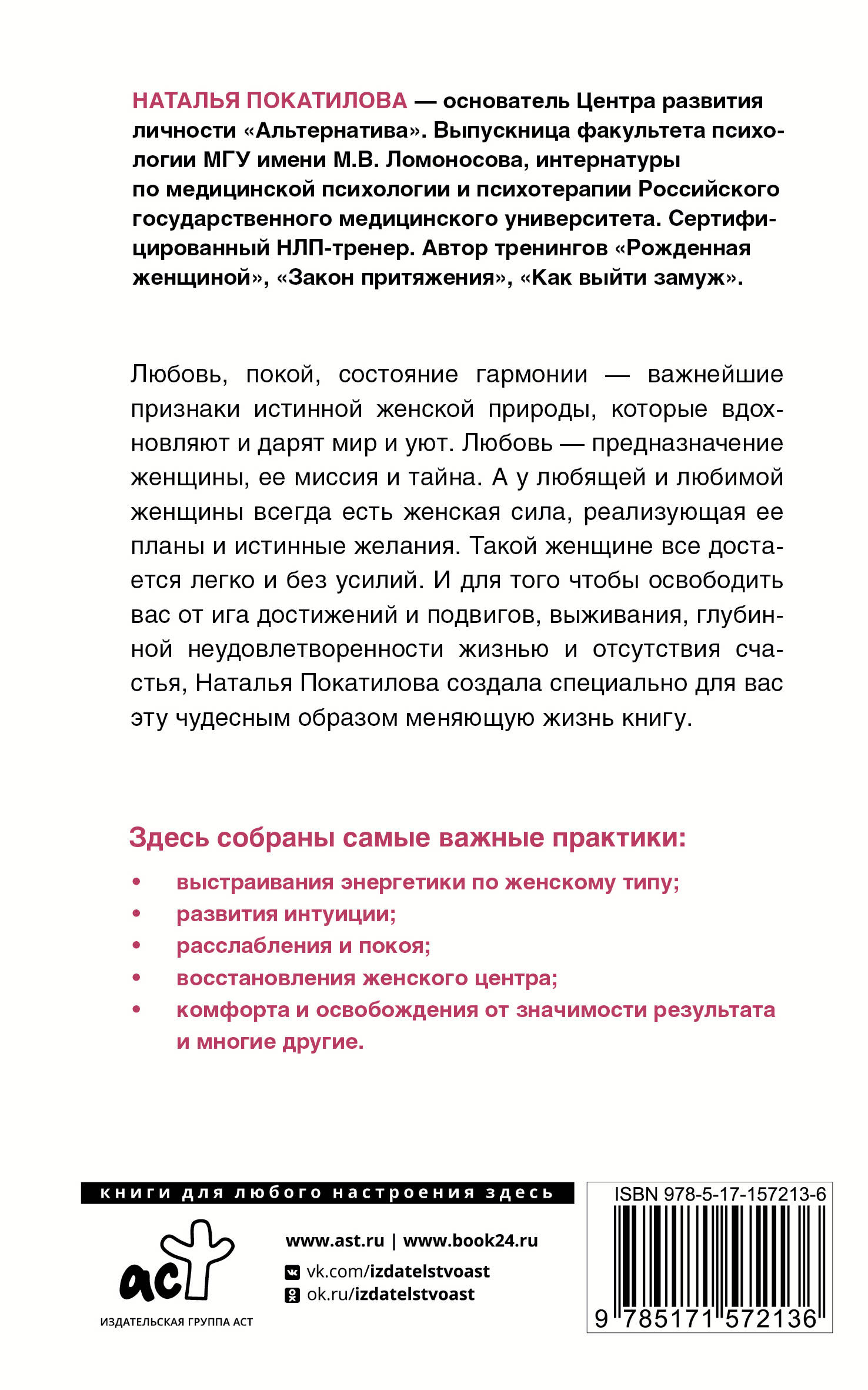 Наталья Покатилова - основатель Центра развития личности "Альтернатива". Выпускница факультета психологии МГУ имени М.В. Ломоносова, интернатуры по медицинской психологии и психотерапии Российского государственного медицинского университета. Сертифицированный НЛП-тренер. Автор тренингов "Рожденная женщиной", "Закон притяжения", "Как выйти замуж". Любовь, покой, состояние гармонии - важнейшие признаки истинной женской природы, которые вдохновляют и дарят мир и уют. Любовь - предназначение женщины, ее миссия и тайна. А у любящей и любимой женщины всегда есть женская сила, реализующая ее планы и истинные желания. Такой женщине все достается легко и без усилий. И для того чтобы освободить вас от ига достижений и подвигов, выживания, глубинной неудовлетворенности жизнью и отсутствия счастья, Наталья Покатилова создала специально для вас эту чудесным образом меняющую жизнь книгу "Рожденная желать. Женская сила в реализации желаний". Здесь собраны самые важные практики: • выстраивания энергетики по женскому типу; • развития интуиции; • расслабления и покоя; • восстановления женского центра; • комфорта и освобождения от значимости результата и многие другие.| Издательство | ИЗДАТЕЛЬСТВО "АСТ" |