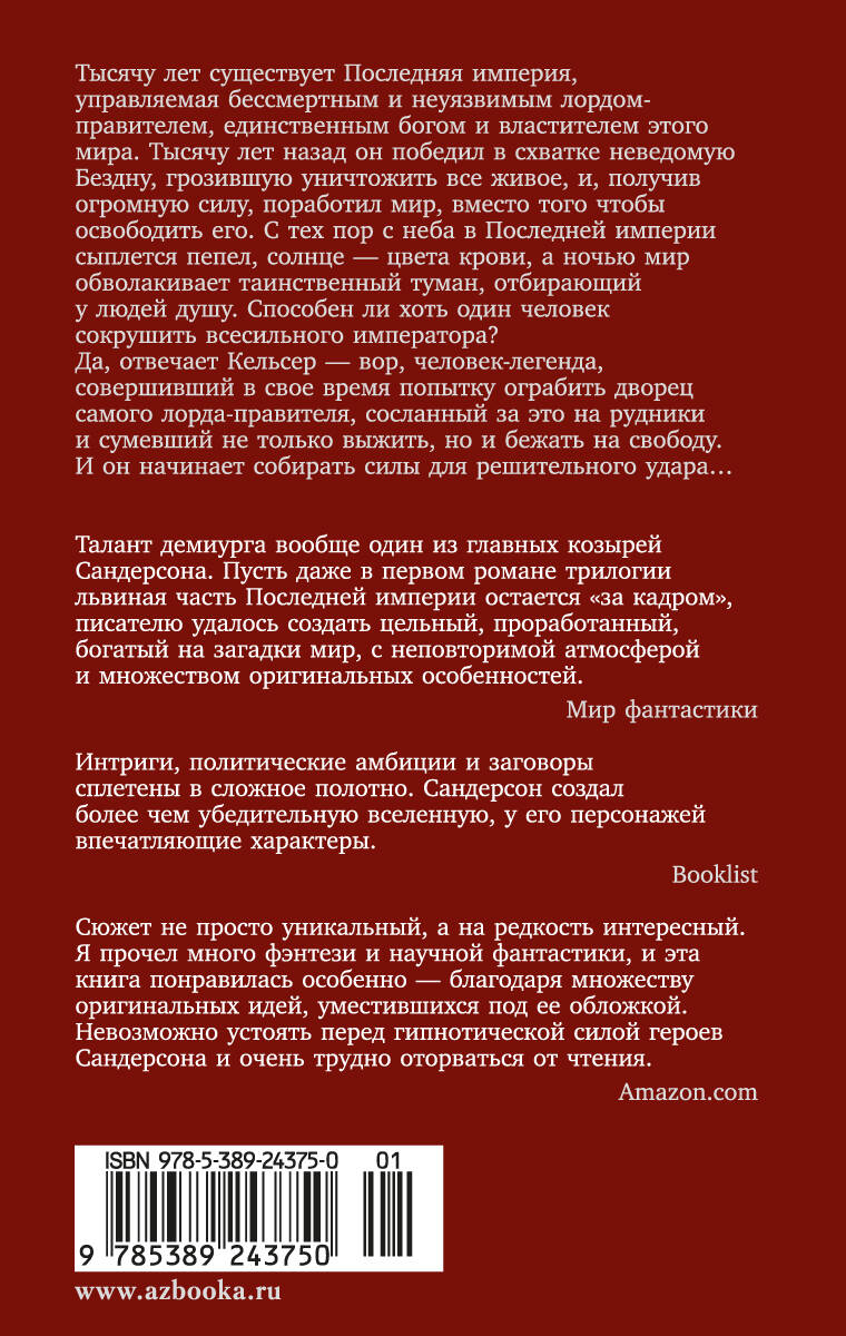 Тысячу лет существует Последняя империя, управляемая бессмертным и неуязвимым лордом-правителем, единственным богом и властителем этого мира. Тысячу лет назад он победил в схватке неведомую Бездну, грозившую уничтожить все живое, и, получив огромную силу, поработил мир, вместо того чтобы освободить его. С тех пор с неба в Последней империи сыплется пепел, солнце - цвета крови, а ночью мир обволакивает таинственный туман, отбирающий у людей душу. Способен ли хоть один человек сокрушить всесильного императора? Да, отвечает Кельсер - вор, человек-легенда, совершивший в свое время попытку ограбить дворец самого лорда-правителя, сосланный за это на рудники и сумевший не только выжить, но и бежать на свободу. И начинает собирать силы для решительного удара…| Издательство | Азбука-Аттикус Издат.группа ООО |