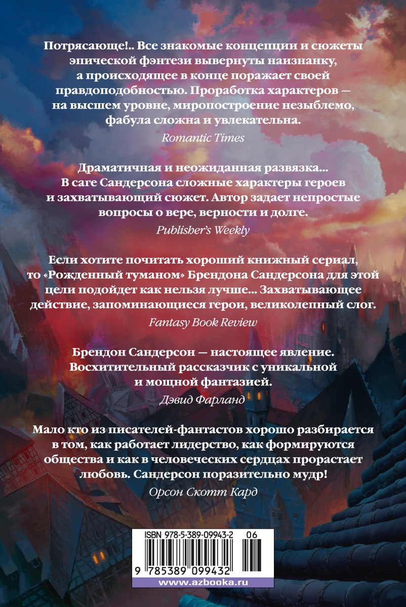 Древнее пророчество истолковано ошибочно - и на свободу выпущен Разрушитель, воплощение распада. Уже не только Последняя империя, но и весь измученный мир с каждым днем все глубже погружается во тьму и хаос. Рожденные туманом Вин и Эленд Венчер должны остановить вездесущее и всеведущее божество, которое управляет ордами безумных монстров и вызывает извержения вулканов. Ключом к победе или поражению может стать атиум Вседержителя, самый ценный из алломантических металлов. Но каково же истинное предназначение этого металла и почему он спрятан так надежно, что даже Разрушителю не удается его найти? Кто поможет могущественным, но не всесильным алломантам в их нелегкой борьбе? И осталась ли хоть малейшая надежда, что мифический спаситель, Герой Веков, все-таки придет?| Издательство | Азбука |