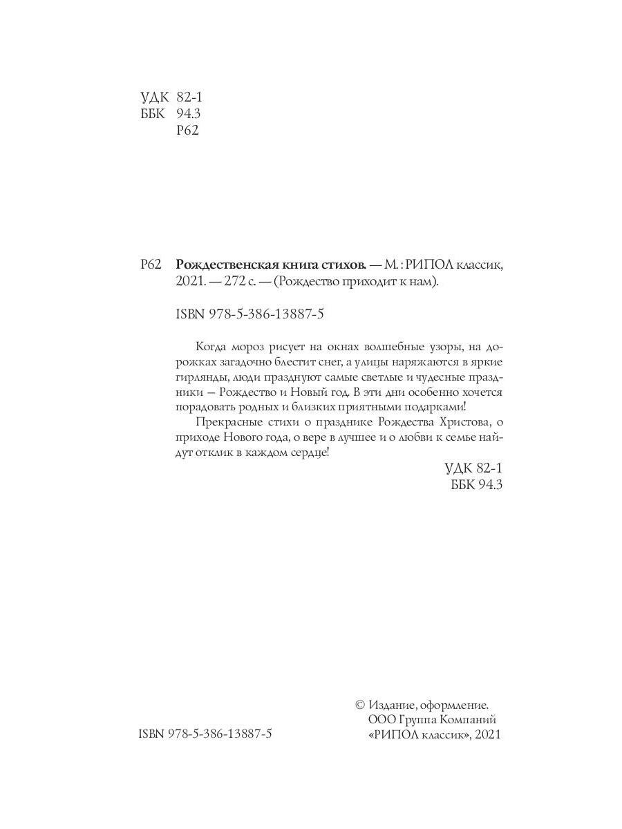 Когда мороз рисует на окнах волшебные узоры, на дорожках загадочно блестит снег, а улицы наряжаются в яркие гирлянды, люди празднуют самые светлые и чудесные праздники - Рождество и Новый год. В эти дни особенно хочется порадовать родных и близких приятными подарками! Прекрасные стихи о празднике Рождества Христова, о приходе Нового года, о вере в лучшее и о любви к семье найдут отклик в каждом сердце!| Издательство | Рипол Классик |