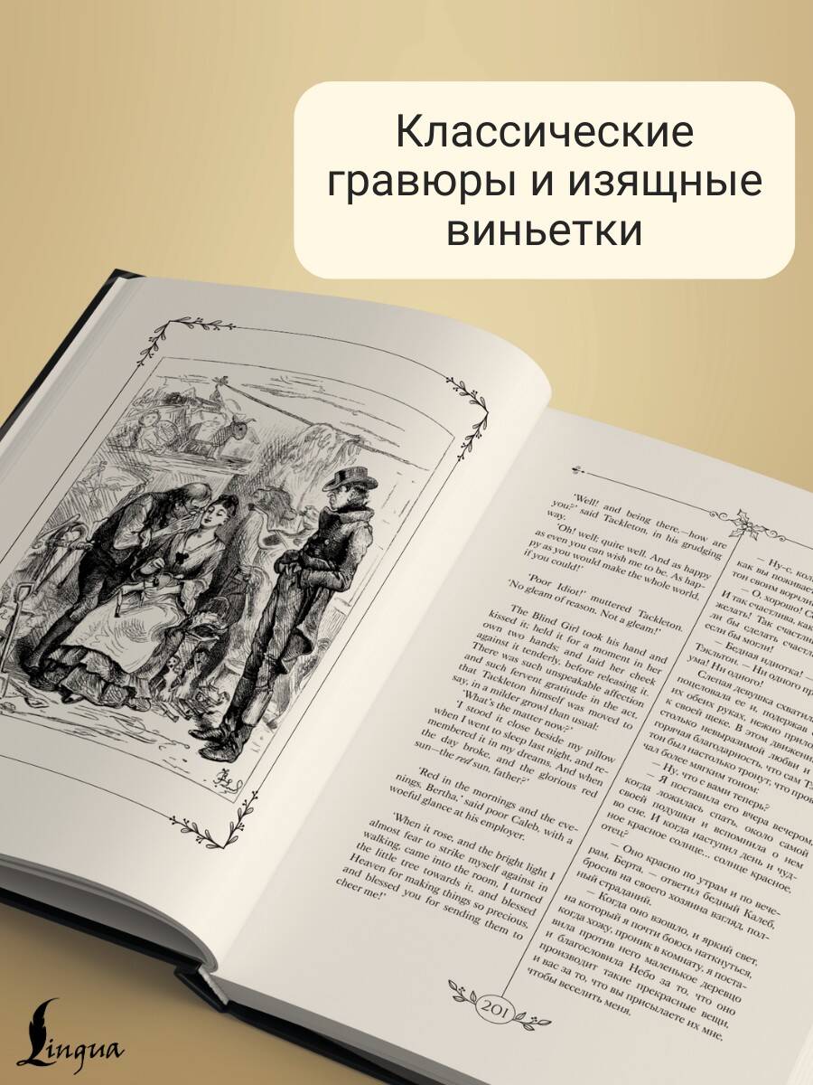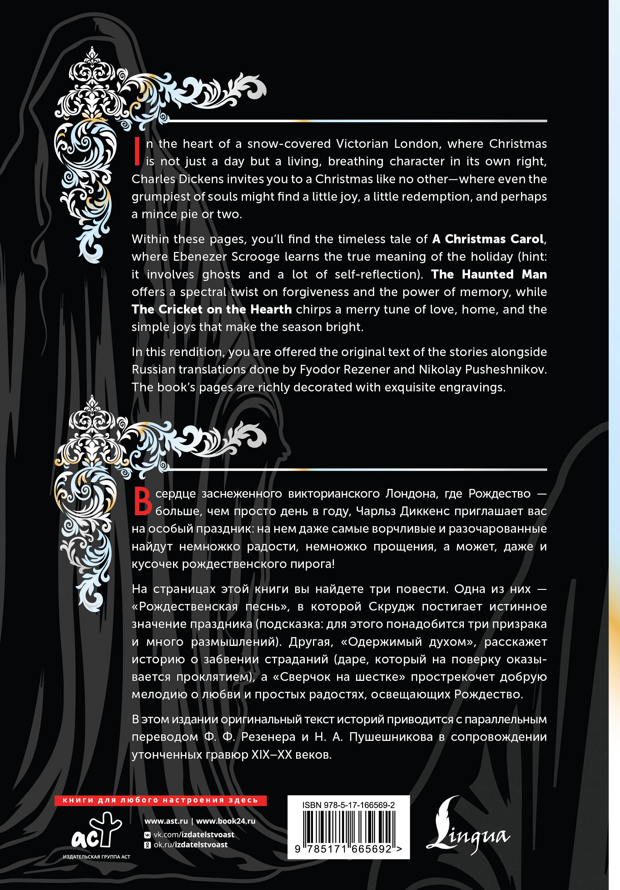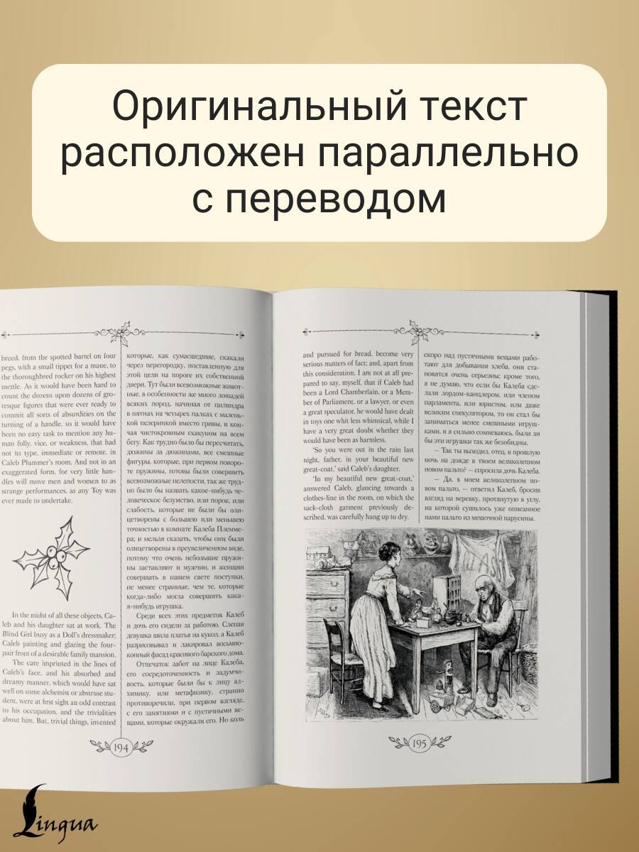 Начав искать идеальный рецепт волшебной зимней книги, мы взяли вечернюю снежную улицу старого Лондона, добавили к ней щедрую порцию викторианского очарования, щепотку мерцающих огоньков на елках, сдобрили все это остроумием Чарльза Диккенса и дали настояться в атмосфере добра и прощения - так мы получили этот праздничный сборник. В нем каждая история пропитана мягким юмором и душевным теплом, как изысканный пирог, замешанный на радости и домашнем уюте. "Рождественская песнь в прозе" - его основа: мрачный Скрудж, варящийся в собственном соку, внезапно открывает для себя радость щедрости и любви. "Сверчок на шестке" - хрустящий рождественский крекер, наполненный домашним уютом и семейным счастьем, а "Одержимый духом" - пикантное угощение с привкусом тайн и прощения, оставляющее долгое и теплое послевкусие. Мы подаем эти истории вместе с их русскими переводами, заботливо выполненными Федором Федоровичем Резенером и Николаем Алексеевичем Пушешниковым, на страницах, украшенных изысканными гравюрами. Для удобства чтения русский текст расположен параллельно с английским, что позволит без труда сравнивать оригинал с переводом, обращать внимание на трудности, с которыми сталкивался переводчик, и отмечать наиболее точно переведенные фрагменты. Обложка книги дополнена переливающейся, словно замерзшее окошко, голографической фольгой и приятна на ощупь благодаря контрасту матовых и глянцевых поверхностей. Ленточка ляссе поможет не потерять страницу, отвлекшись на приготовления к празднику и время с близкими. Книгу можно приобрести не только для своей коллекции, но и в качестве подарка дорогим и близким людям на Рождество, Новый год или день рождения.| Издательство | Издательство "АСТ" |