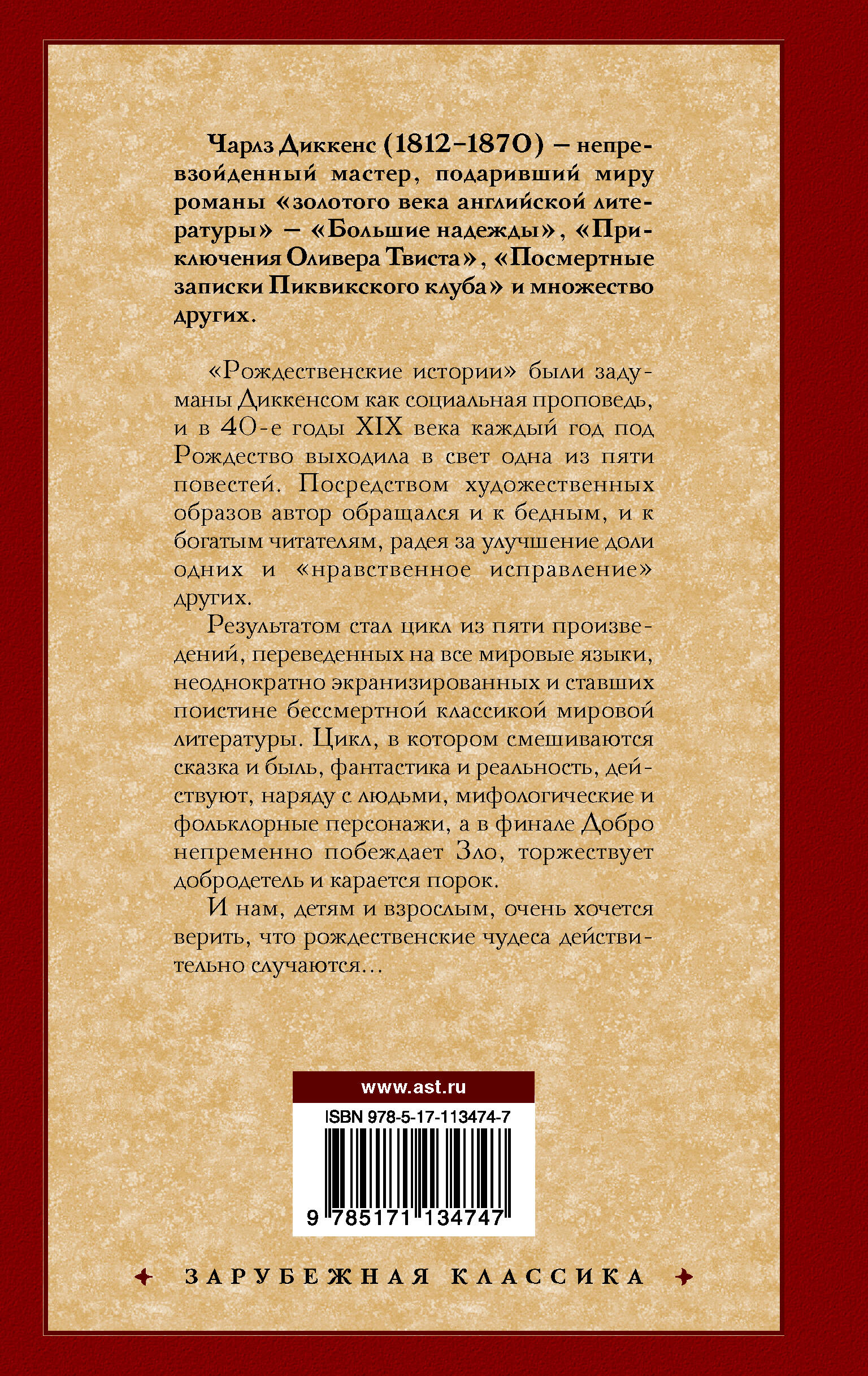 "Рождественские истории" были задуманы Диккенсом как социальная проповедь, и в 40-е годы XIX века каждый год под Рождество выходила в свет одна из пяти повестей. Посредством художественных образов автор обращался и к бедным, и к богатым читателям, радея за улучшение доли одних и "нравственное исправление" других. Результатом стал цикл из пяти произведений, переведенных на все мировые языки, неоднократно экранизированных и ставших поистине бессмертной классикой мировой литературы. Цикл, в котором смешиваются сказка и быль, фантастика и реальность, действуют, наряду с людьми, мифологические и фольклорные персонажи, а в финале Добро непременно побеждает Зло, торжествует добродетель и карается порок. И нам, детям и взрослым, очень хочется верить, что рождественские чудеса действительно случаются…