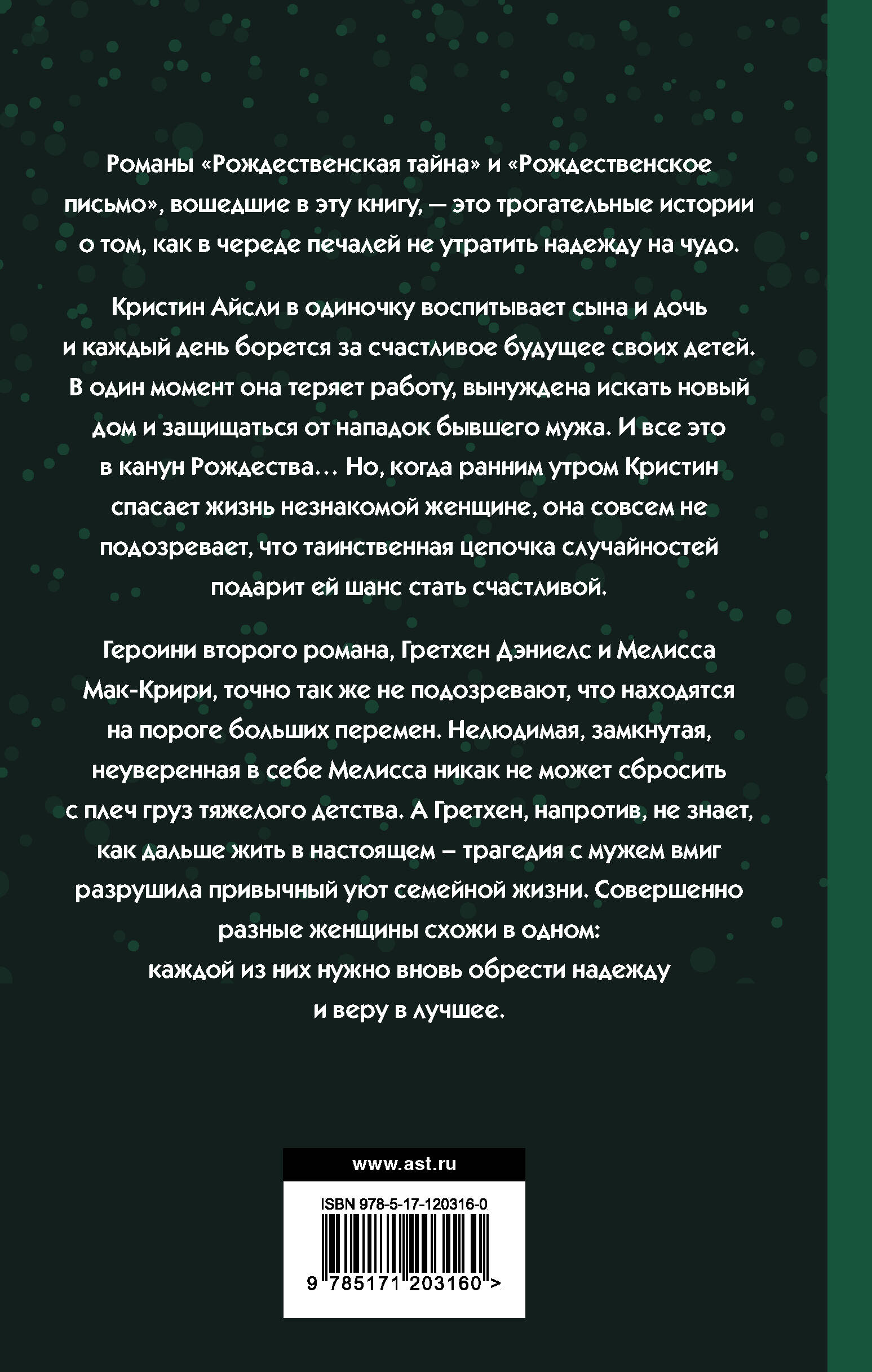 Романы "Рождественская тайна" и "Рождественское письмо", вошедшие в эту книгу - это трогательные истории о том, как в череде печалей не утратить надежду на чудо. Кристин Айсли в одиночку воспитывает сына и дочь и каждый день борется за счастливое будущее своих детей. В один момент она теряет работу, вынуждена искать новый дом и защищаться от нападок бывшего мужа. И все это в канун Рождества… Но, когда ранним утром Кристин спасает жизнь незнакомой женщине, она совсем не подозревает, что таинственная цепочка случайностей подарит ей шанс стать счастливой. Героини второго романа, Гретхен Дэниелс и Мелисса МакКрири, точно также не подозревают, что находятся на пороге больших перемен. Нелюдимая, замкнутая, неуверенная в себе Мелисса никак не может сбросить с плеч груз тяжелого детства. А Гретхен - напротив: не знает, как дальше жить в настоящем - трагедия с мужем вмиг разрушила привычный уют семейной жизни. Совершенно разные женщины схожи в одном: каждой из них нужно вновь обрести надежду и веру в лучшее.| Издательство | ИЗДАТЕЛЬСТВО "АСТ" |