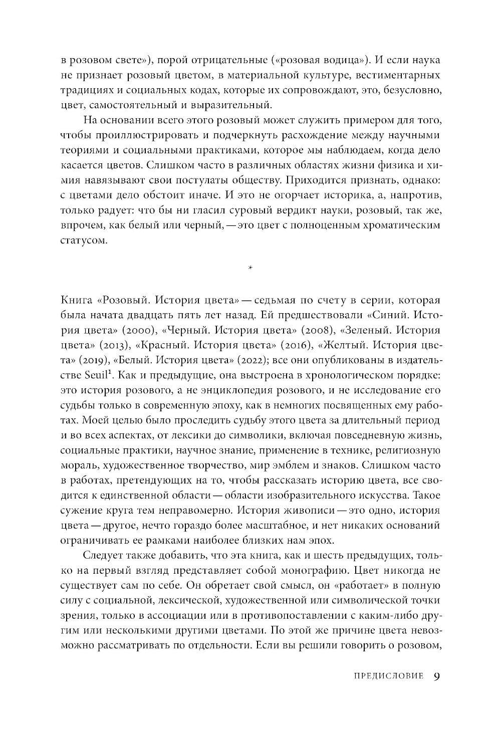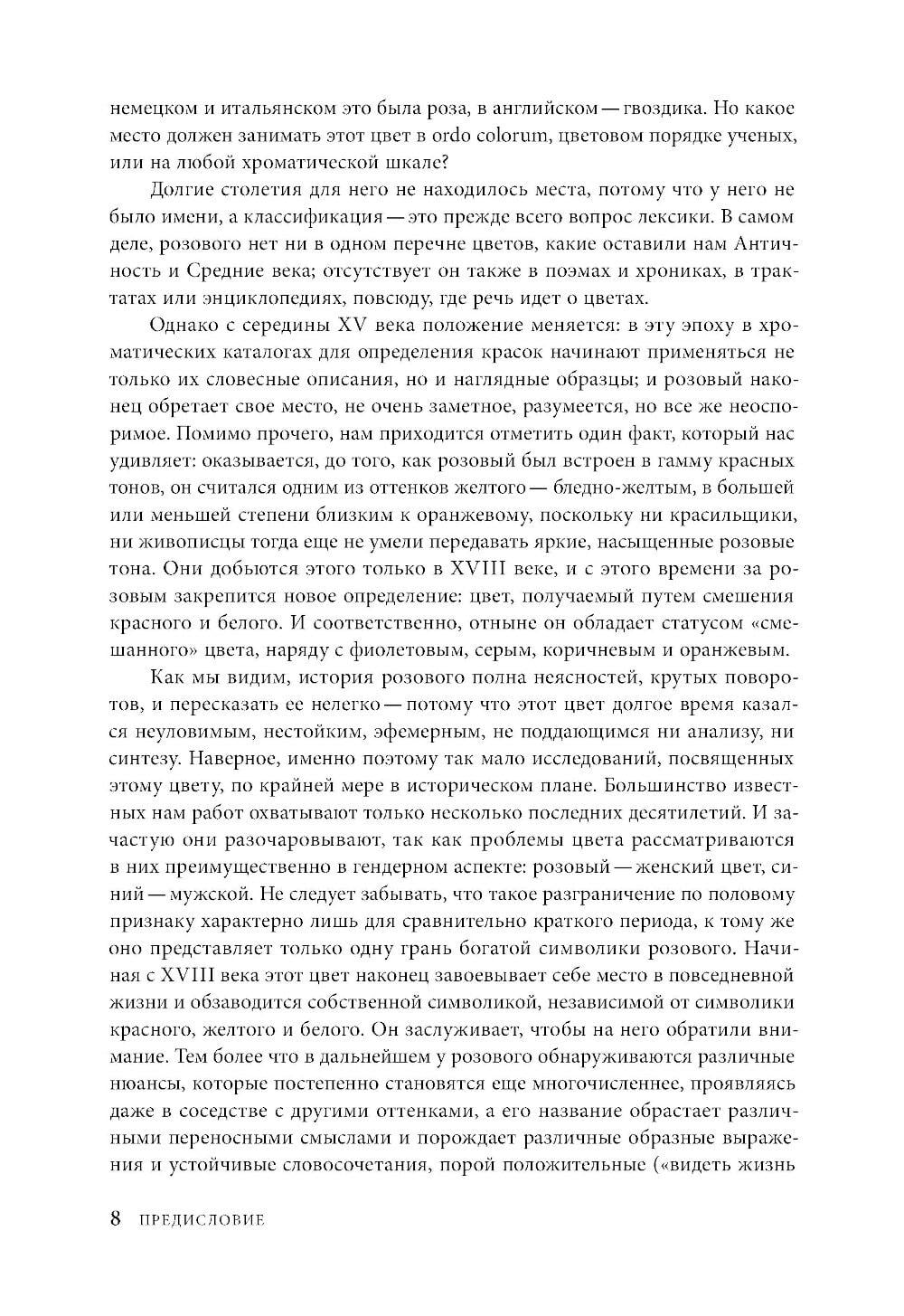 Несмотря на то, что розовый цвет часто встречается в природе, в европейской культуре он был редкостью вплоть до XIV века: ни в живописи, ни в одежде, ни в быту он почти не использовался. Все изменилось с началом импорта в Европу экзотического красителя - фернамбукового дерева, а позже - с развитием флористики: только в XVIII веке удалось вывести сорта роз действительно розового цвета. Именно тогда цвет и получил своё имя от названия цветка. Когда и как розовый стал «женским» цветом? Как его становление было связано с модой, ботаникой, геральдикой и религиозной символикой? Почему в Средние века он ассоциировался скорее с мужественностью, а в XX веке оказался в центре эстетических, социальных и идеологических сдвигов? Опираясь на множество источников, автор прослеживает сложную и противоречивую судьбу розового цвета - от пещерных росписей и античных ваз до куклы Барби. Мишель Пастуро - ведущий историк-медиевист, профессор Практической школы высших исследований в Париже. Ранее в издательстве «НЛО» уже выходили его книги «Синий», «Черный», «Красный», «Зеленый», «Белый» и «Желтый», а также «Дьявольская материя. История полосок и полосатых тканей».| Издательство | Новое литературное обозрение |