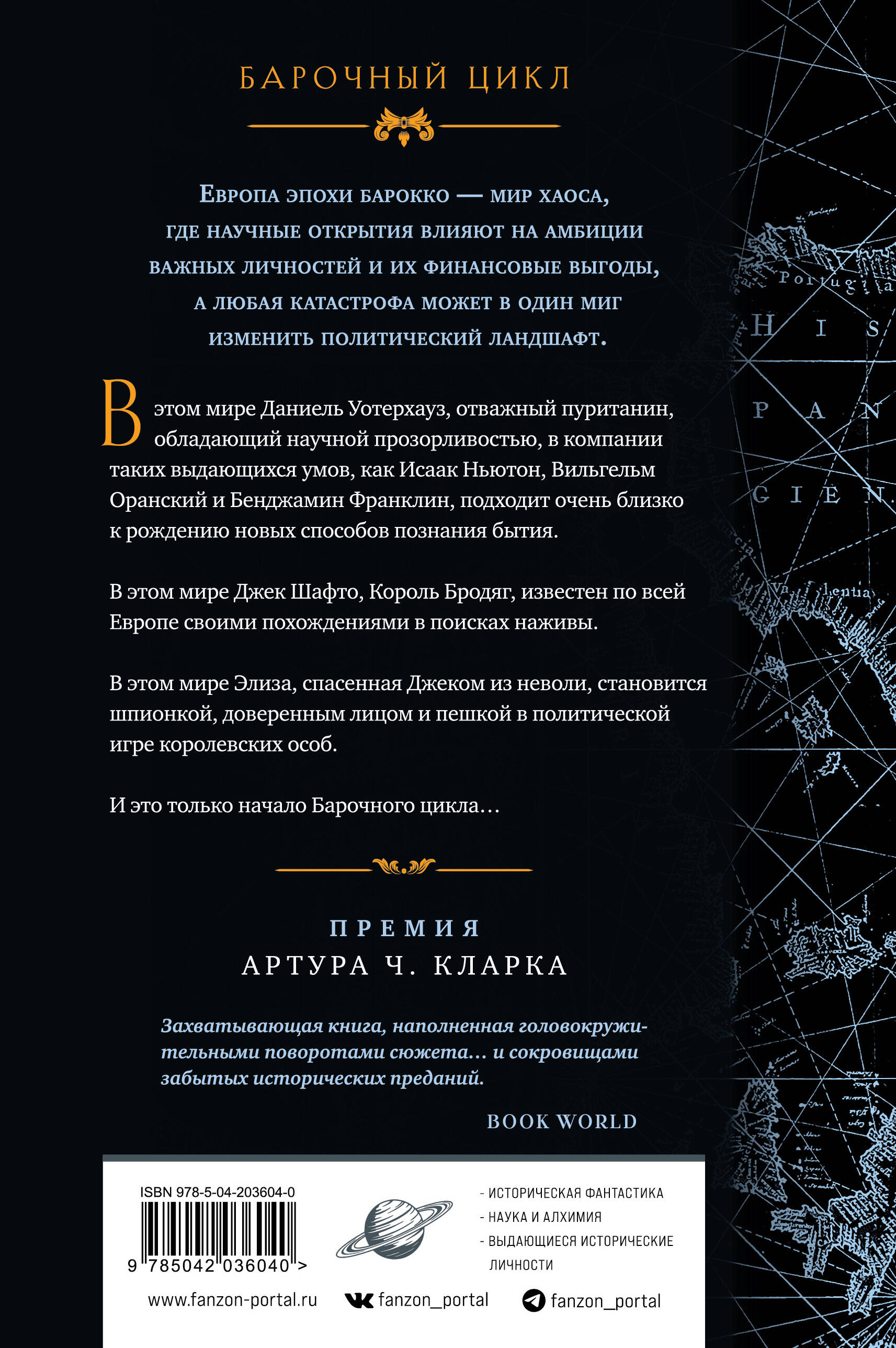 Лауреат премии Артура Ч. Кларка. Номинант на премии «Локус», «Мраморный фавн» и премию Академии НФ, фэнтези и хоррора. Это история Даниеля Уотерхауза, бесстрашного мыслителя и храброго пуританина, который стремится к знаниям в компании величайших умов Европы эпохи барокко - в хаотичном мире, где разум борется с кровавыми амбициями сильных мира сего и где катастрофа, природная или иная, может в одночасье изменить политический ландшафт. Это хроника захватывающих дух подвигов Джека Шафто - лондонского уличного мальчишки, превратившегося в отъявленного авантюриста и легендарного Короля Бродяг, - рискующего жизнью (и конечностями) ради удачи и любви. Это история Элизы, спасенной Джеком из турецкого гарема, чтобы стать шпионкой, доверенным лицом и пешкой королевских особ. В ее силах заново открыть Европу с помощью новорожденной силы экономической науки. Великолепный, масштабный, увлекательный и бесконечно изобретательный роман, который оживляет замечательную эпоху и ее ключевые события. Начинается эпоха барокко… «Вам захочется, чтобы этот роман не заканчивался». - Time magazine «Роман исследует философские проблемы современности через остроумные, напряженные и забавные повороты сюжета». - New York Times «Масштабная, захватывающая история». - Seattle Times «Захватывающая книга, наполненная головокружительными поворотами сюжета… и сокровищами забытых исторических преданий». - Book World| Издательство | ООО "Издательство "Эксмо" |