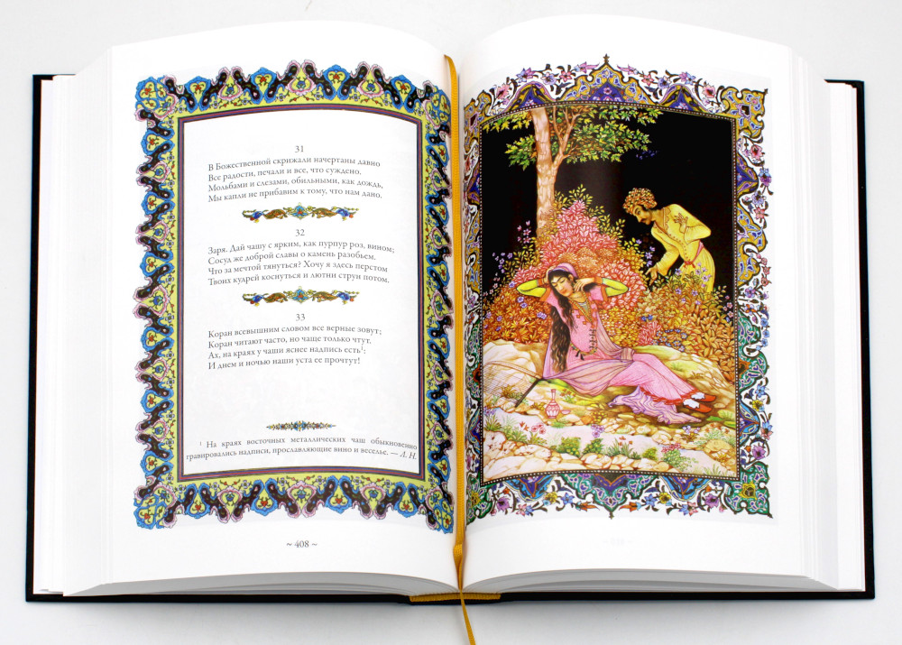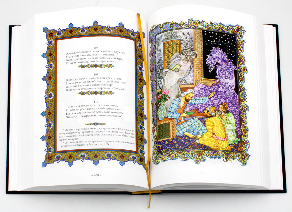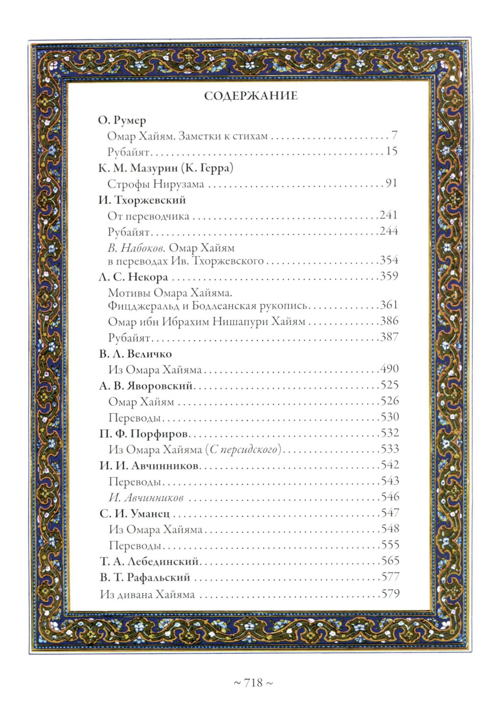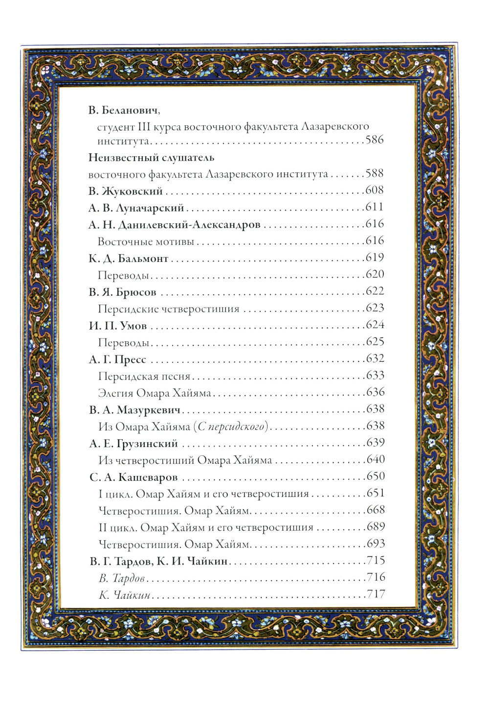 Сборник включает переводы поэзии Омара Хайяма, которые были выполнены двадцатью четырьмя русскими авторами в конце XIX и в начале XX века. Многие из этих переводов ни разу не публиковались после революции. Для каждого переводчика дана краткая историческая справка. Сборник украшают работы британских графиков Э. Салливана, Р. Булла, Э. Дюлака, Г. Росса, В. Погани и иранского миниатюриста Хусейна Бехзада.| Издательство | СЗКЭО |