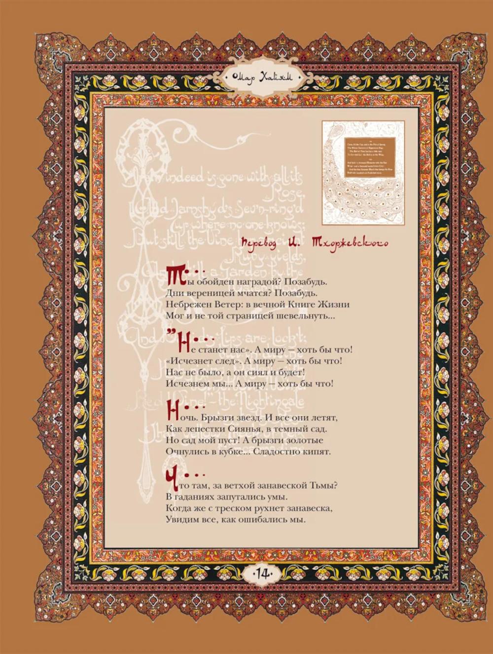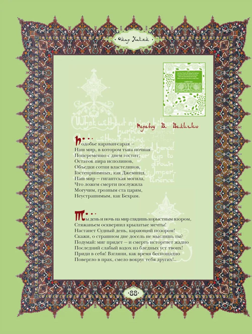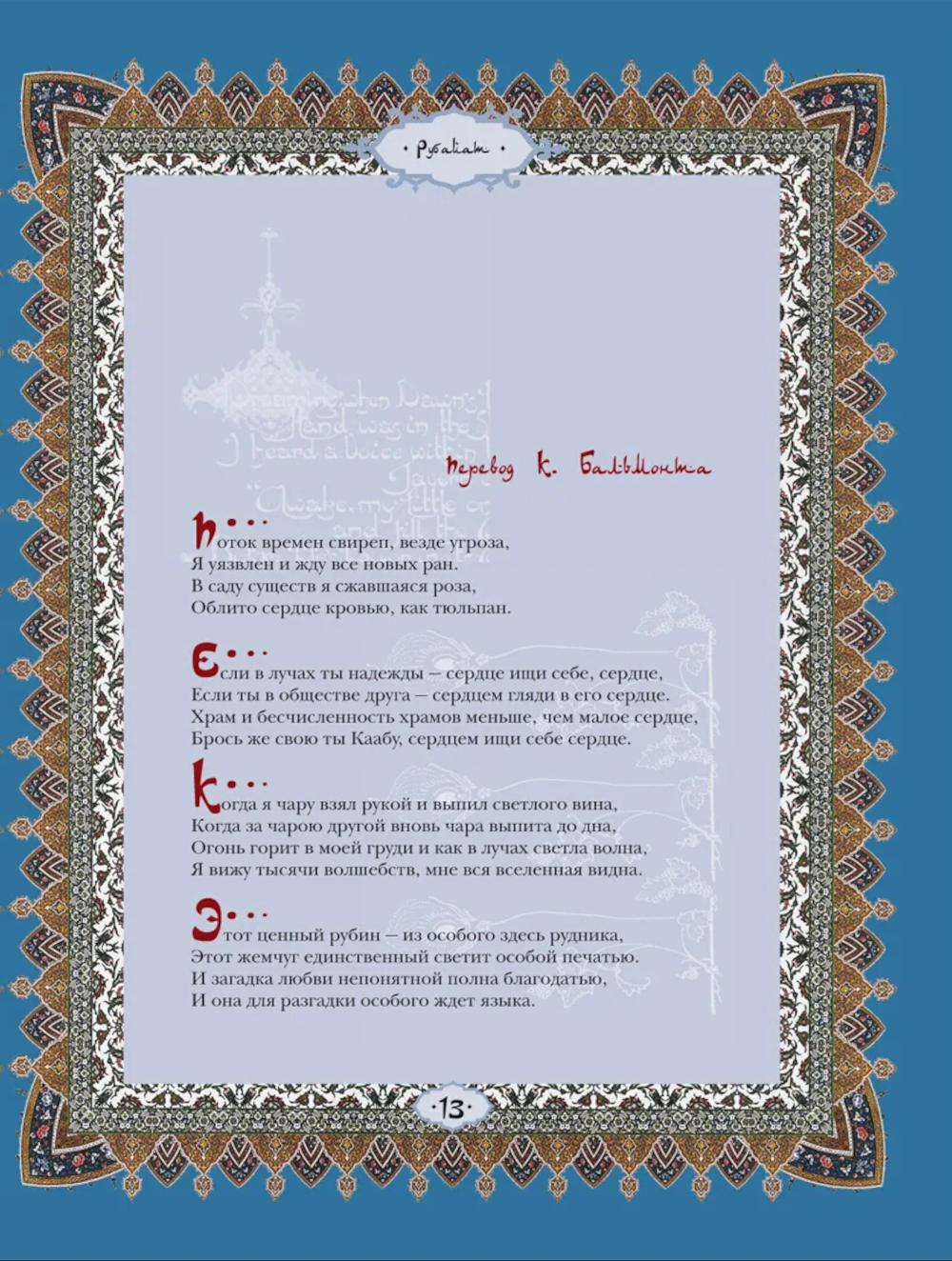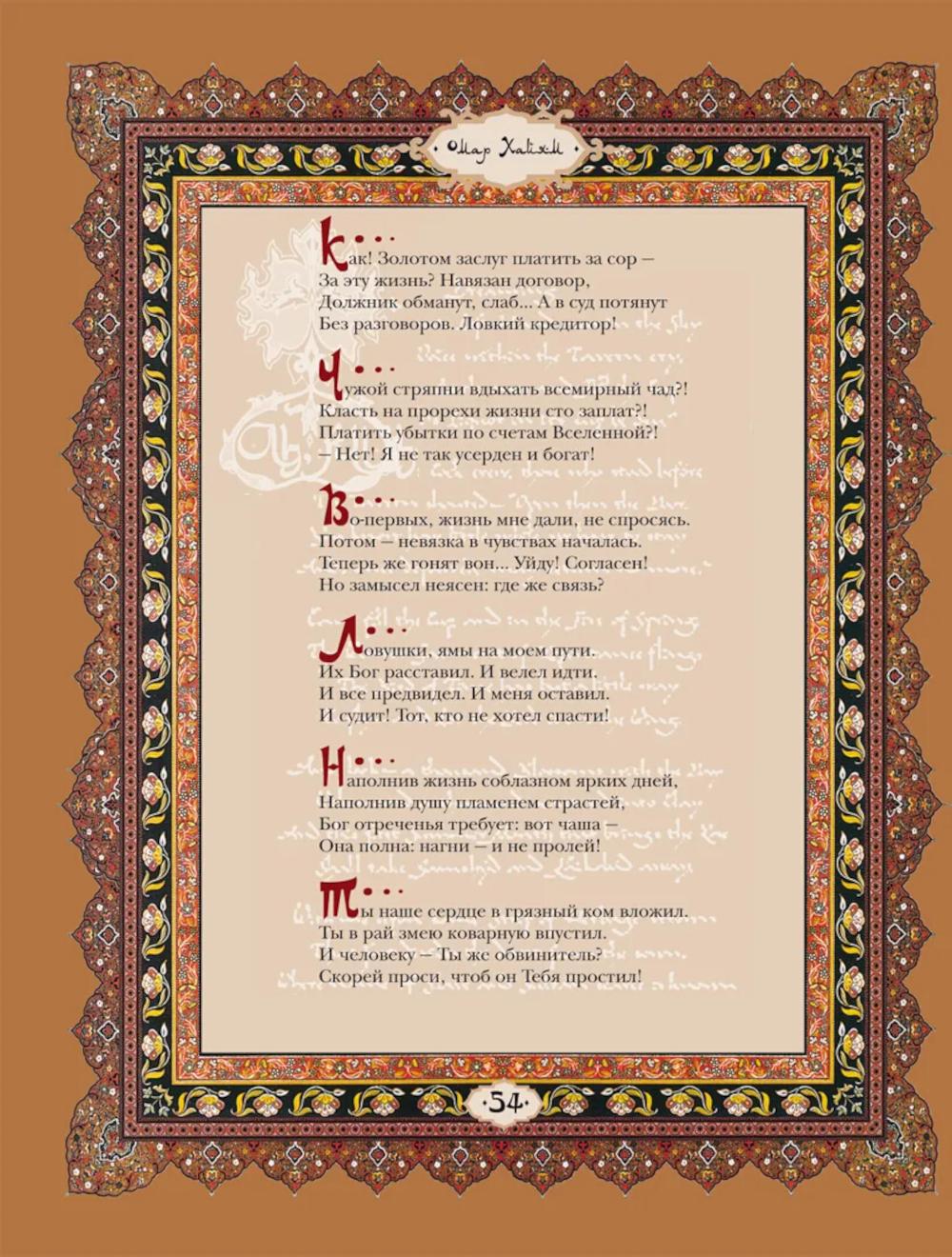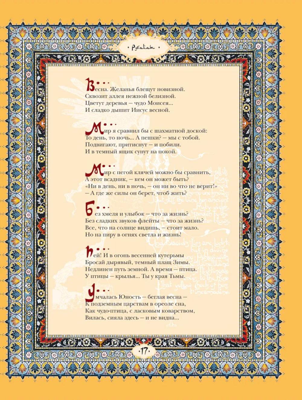 Великий персидский поэт Омар Хайям (ок. 1048-1131) был математиком, астрономом, философом. Поэзию Омара Хайяма открыл для европейского читателя в ХIХ веке английский поэт Эдвард Фицджеральд. С этого момента мировая слава его становилась все популярней, а мода на Хайяма превратилась в эпидемию. Биография Омара Хайяма окутана легендами, мифами и домыслами, невозможно определить, сколько четверостиший подлинно хайямовские, очевидно одно - перед нами величайший поэтический гений, чья поэзия родилась из ритмического биения двух влюбленных сердец...| Издательство | Просвещение-Союз |