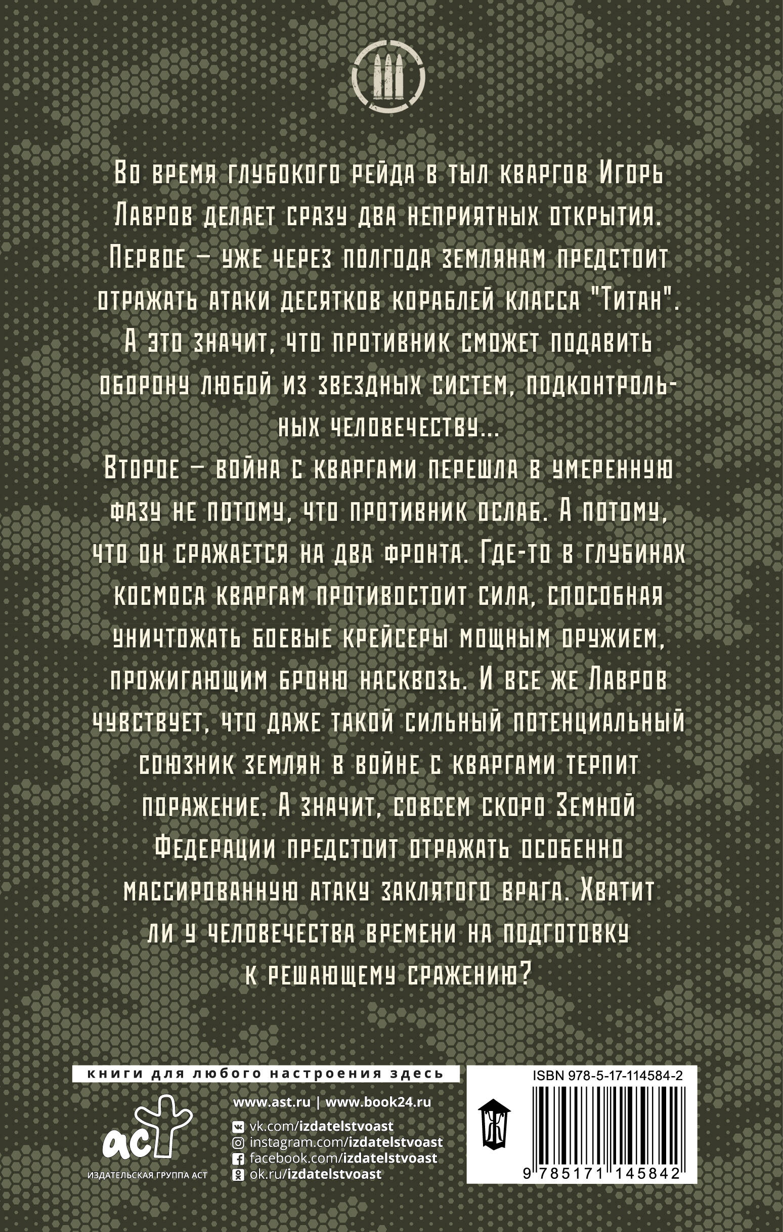Во время глубокого рейда в тыл кваргов Игорь Лавров делает сразу два неприятных открытия. Первое - уже через полгода землянам предстоит отражать атаки десятков кораблей класса "Титан". А это значит, что противник сможет подавить оборону любой из звездных систем, подконтрольных человечеству… Второе - война с кваргами перешла в умеренную фазу не потому, что противник ослаб. А потому, что он сражается на два фронта. Где-то в глубинах космоса кваргам противостоит сила, способная уничтожать боевые крейсеры мощным оружием, прожигающим броню насквозь. И все же Лавров чувствует, что даже такой сильный потенциальный союзник землян в войне с кваргами терпит поражение. А значит, совсем скоро Земной Федерации предстоит отражать особенно массированную атаку заклятого врага. Хватит ли у человечества времени на подготовку к решающему сражению?| Издательство | Издательство "АСТ" |