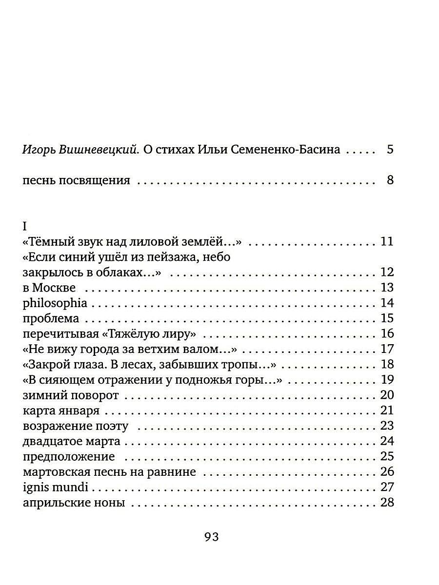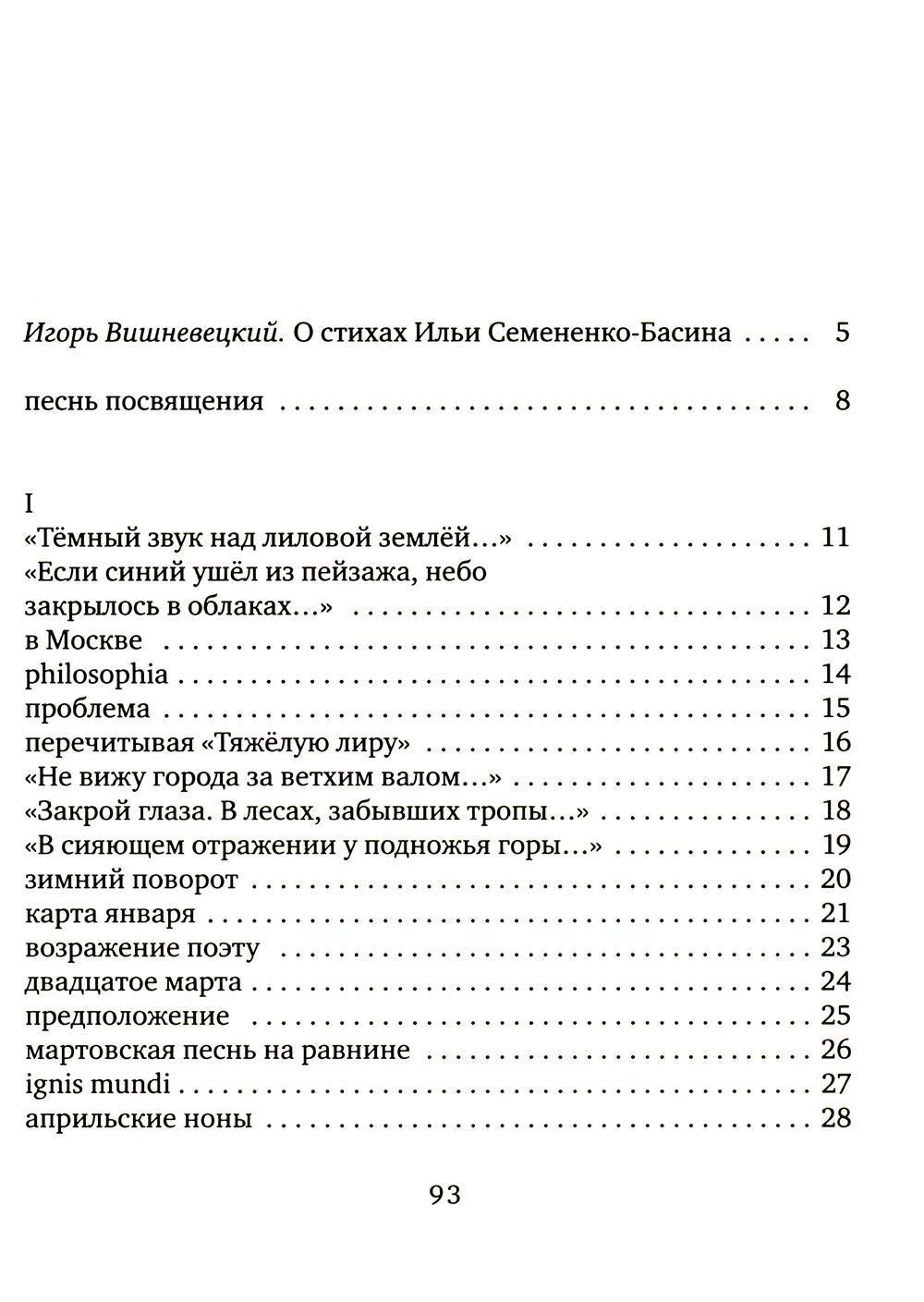 Первая книга И. Семененко-Басина, состоящая из стихотворений 2006-2011 гг. , открывает сложившегося поэта. Наследник русской не официальной поэзии 1920-1960-х гг. , Семененко-Басин сочетает поиск неисследованных ресурсов восприятия со способностью видеть мир символистично. Незримое присутствие тематики самосозидания личности заставляет вспомнить также традиции романтизма. Автор приглашает в путешествие по одушевленным ландшафтам личной истории, к соприкосновению с энергией природы и социальных движений, запечатленных в речи.