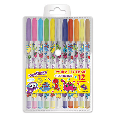 Ручки гелевые "Юнландия", 12 цветов, неоновые чернила, корпус с печатью, 0,7 мм, линия 0,5 мм