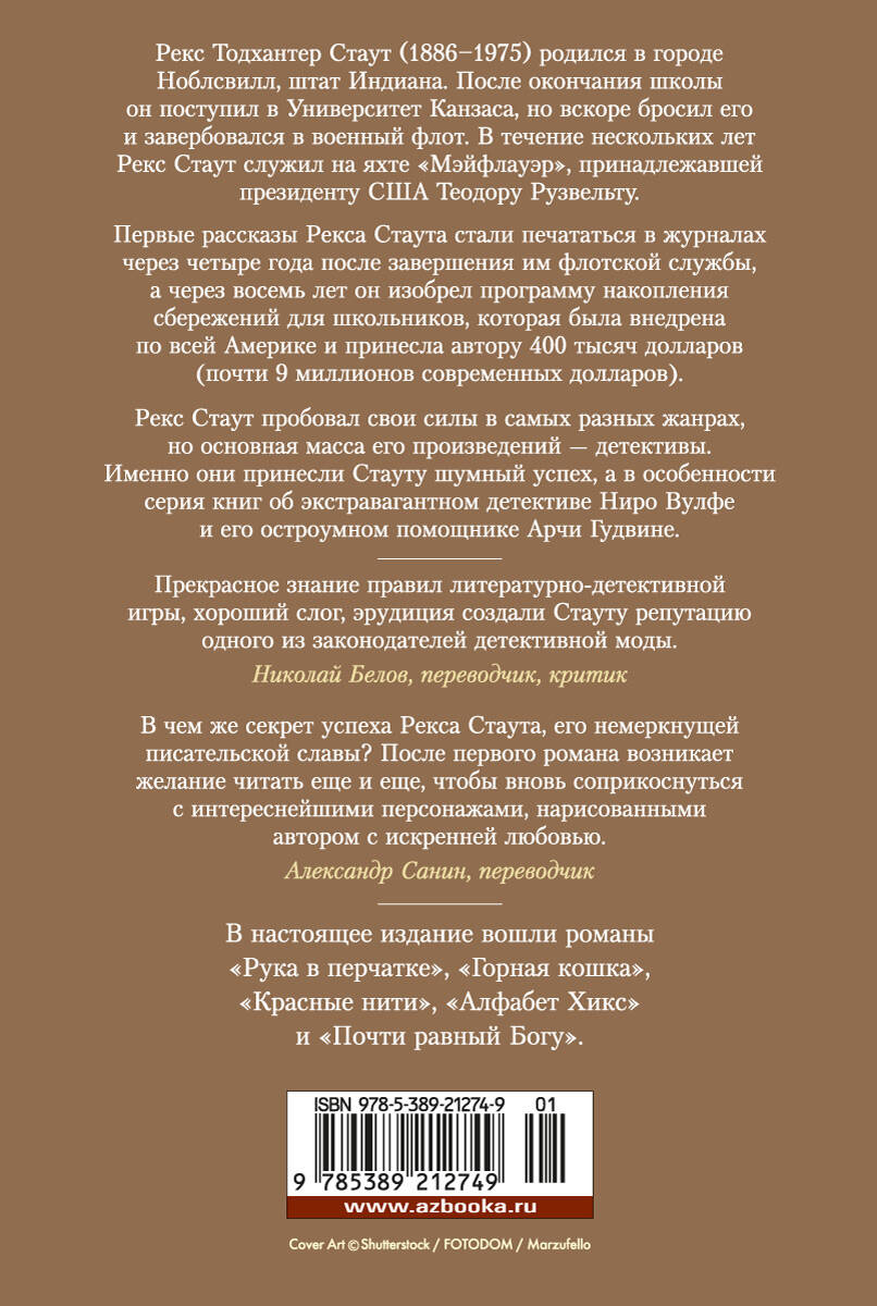 Рекс Стаут наиболее известен как создатель цикла произведений о Ниро Вулфе, однако в этом сборнике знаменитый сыщик уступает место другим героям. Частный детектив Теодолинда Боннер получает задание от президента промышленной корпорации: найти сведения, порочащие последователя религиозной секты, - тот вытягивает деньги у жены промышленника, а с недавних пор еще и собирается стать его зятем. Едва Дол начинает дело, как находит своего работодателя мертвым, задушенным проволокой. Но чтобы не порезаться, преступнику нужны были толстые перчатки… ("Рука в перчатке") Делия Бранд арестована по подозрению в убийстве. Неудивительно, ведь у нее есть мотив, а кроме того, она прямо заявляла, что намерена застрелить человека. Однако лишь немногие знают, что Делия имела в виду вовсе не того, кого обнаружили мертвым рядом с ее сумочкой и револьвером. Когда подтверждается, что сумочку и оружие украли, Делию освобождают, и она начинает собственное расследование ("Горная кошка"). Инспектору Кремеру приходится прервать заслуженный отпуск: крупный биржевой игрок Вэл Кэрью убит у гробницы своей жены-индианки. В кулаке жертвы зажат кусочек шерстяной красной нити - особой пряжи, из которой несколько веков назад индейцы ткали одеяла ("Красные нити"). Алфабет Хикс - лишенный лицензии адвокат. Теперь он водит такси и иногда берется за расследования. К нему обращается Джудит Данди: муж обвиняет ее в том, что она выдает его деловые секреты конкуренту, и женщина хочет доказать свою невиновность. Однако дело о промышленном шпионаже оборачивается делом об убийстве ("Алфабет Хикс"). Особняком стоит психологический роман "Почти равный Богу". С первых страниц известно, кто замыслил убийство, но что к этому привело и хватит ли духа совершить задуманное, неясно до самого конца...| Издательство | Издательство АЗБУКА ООО |