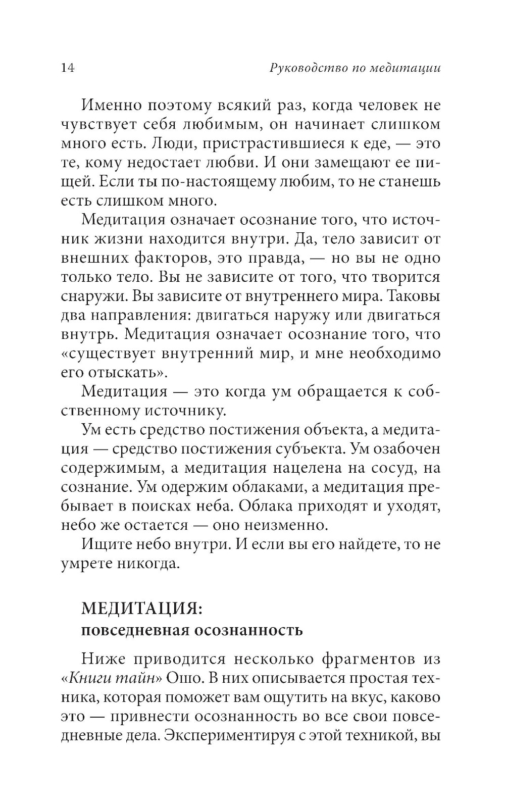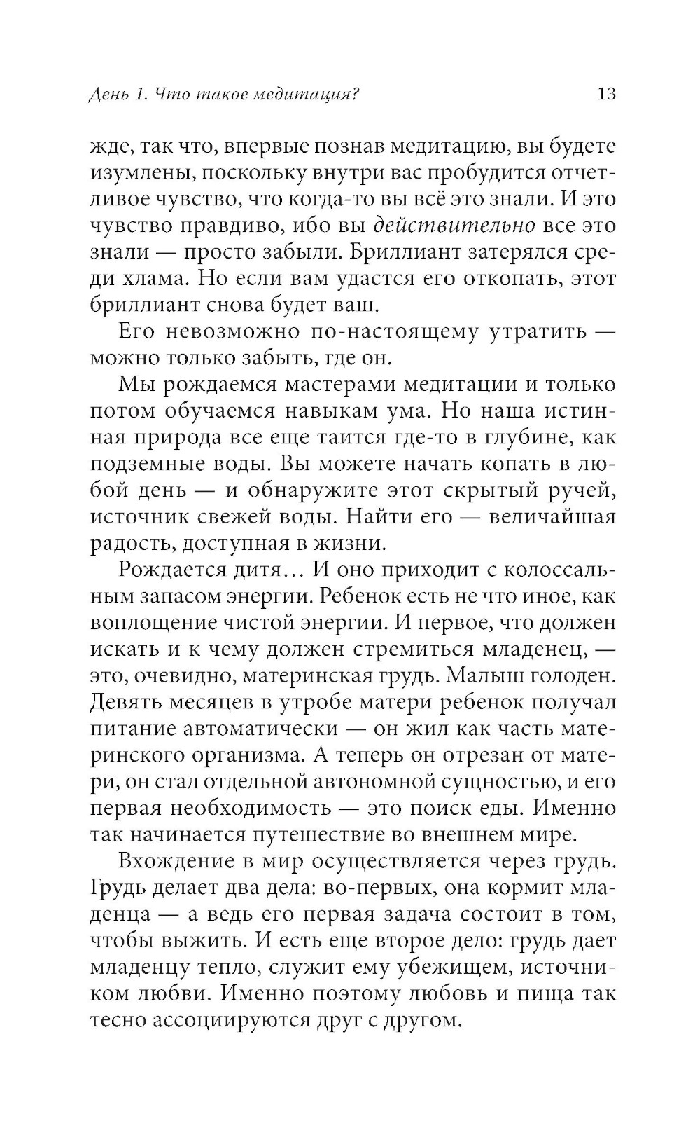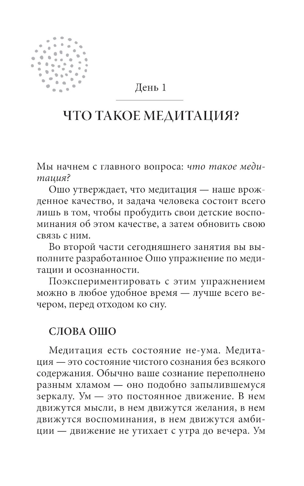 Гиперактивному уму XXI века трудно расслабиться и достичь ощущения тишины и осознанности. Признавая это, почитаемый мистик Ошо разработал новые техники медитации для решения проблем современного ума. Эта книга объясняет методы Ошо в удобном формате. Каждый день изучайте один новый аспект медитативной жизни и овладевайте одной простой практикой медитации и осознанности. Фрагменты из бесед Ошо будут вдохновлять вас и направлять на пути к трансформации сознания.| Издательство | София |