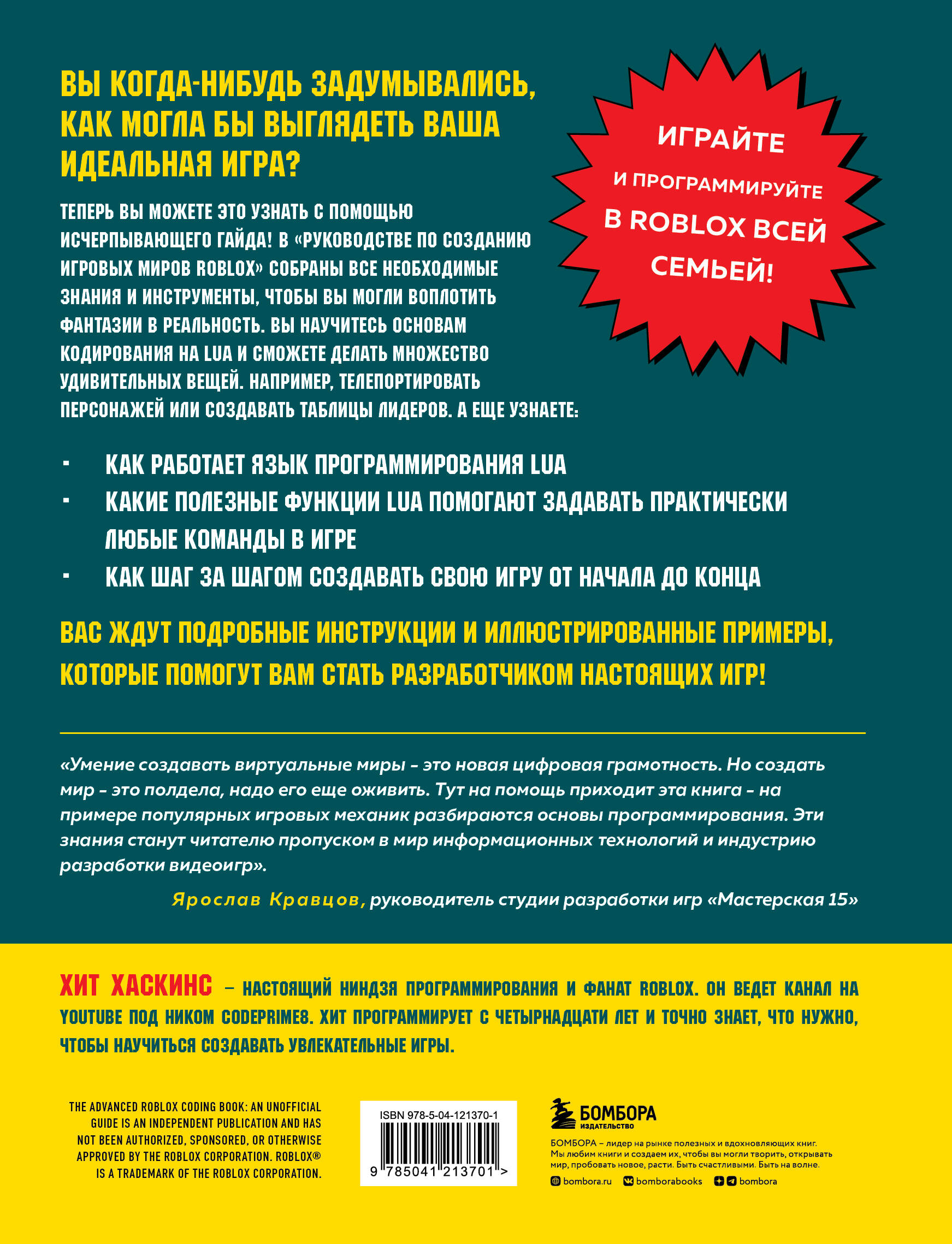 Играйте и программируйте в Roblox всей семьей! Вы когда-нибудь задумывались, как могла бы выглядеть ваша идеальная игра? Теперь вы можете это узнать с помощью этого исчерпывающего гайда! В «Руководстве по созданию игровых миров Roblox» собраны все необходимые знания и инструменты, чтобы вы могли воплотить фантазии в реальность. Вы научитесь основам кодирования на Lua и сможете делать множество удивительных вещей. Например, телепортировать персонажей или создавать таблицы лидеров. А еще узнаете: - Как работает язык программирования Lua. - Какие полезные функции Lua помогают задавать практически любые команды в игре. - Как шаг за шагом создавать свою игру от начала до конца. Вас ждут подробные инструкции и иллюстрированные примеры, которые помогут вам стать разработчиком настоящих игр! Хит Хаскинс - настоящий ниндзя программирования и фанат Roblox. Он ведет канал на YouTube под ником CodePrime8. Хит программирует с четырнадцати лет и точно знает, что нужно, чтобы научиться создавать увлекательные игры.| Издательство | ООО "Издательство "Эксмо" |