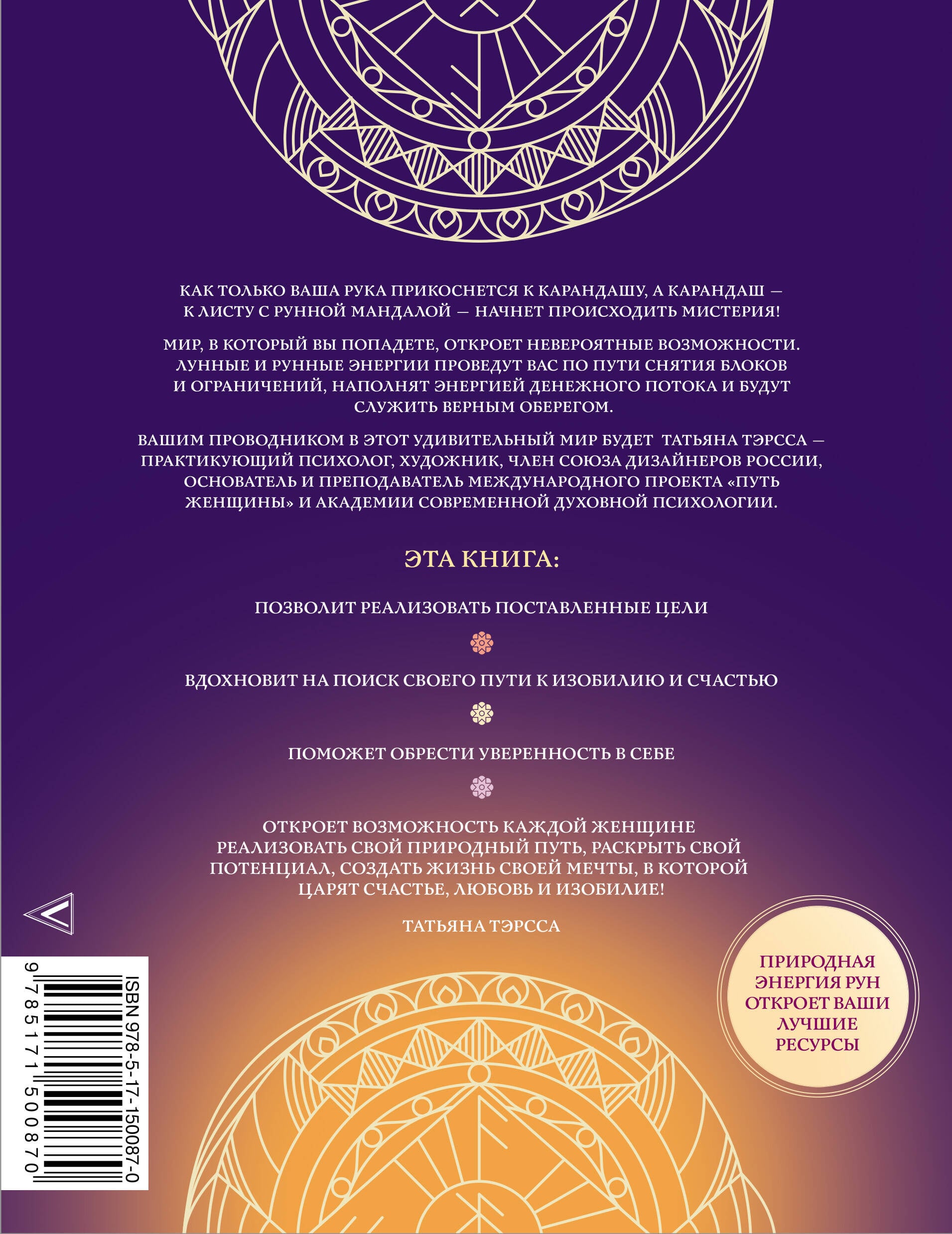 Татьяна Тэрсса - практикующий психолог, художник, член Союза Дизайнеров России, основатель и преподаватель международного проекта "Путь Женщины" и Академии современной Духовной психологии. Как только Ваша рука прикоснется к карандашу, а карандаш - к листу с Рунной Мандалой, начнет происходит мистерия! Тот мир, в который Вы попадете, откроет невероятные возможности. Лунные и Рунные энергии проведут Вас по пути снятия блоков и ограничений, наполнят энергией Денежного Потока и будут служить верным оберегом. Это издание книга откроет возможность каждой Женщине раскрыть природный потенциал, создать жизнь своей мечты, в которой царят счастье, любовь и Изобилие!| Издательство | ИЗДАТЕЛЬСТВО "АСТ" |