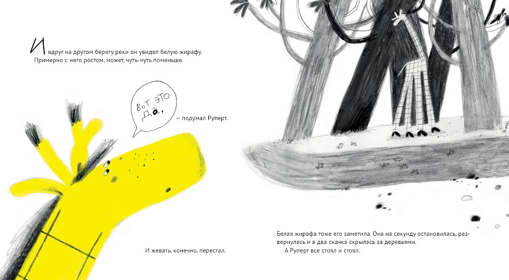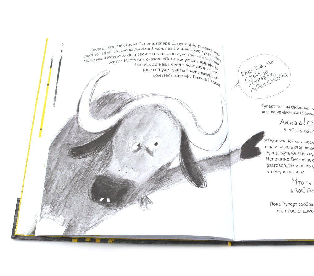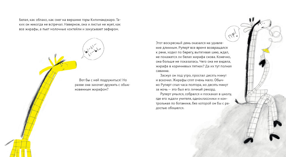 Как трудно жить, когда ты самый обыкновенный, ничем не примечательный жираф. Но еще труднее, если ты жираф необыкновенный, ни на кого не похожий. Хорошо, что мы все разные, а то было бы скучно. И хорошо, что мы умеем дружить. Руперт - самый обыкновенный жираф, который ходит в звериную школу. Однажды в его классе появляется новая ученица - белая жирафа Бланка. Руперт восхищен удивительным окрасом новенькой и хочет во что бы то ни стало ей понравиться. Но что для этого нужно? Хобот, как у слона? Крылья, как у попугая? А может, львиная грива? Бланка же втайне мечтает стать самой обыкновенной жирафой. Звери встречаются на дне рождения гепарда, где их ждет большой сюрприз, который все расставит по своим местам.| Издательство | Белая ворона/ALBUS CORVUS |