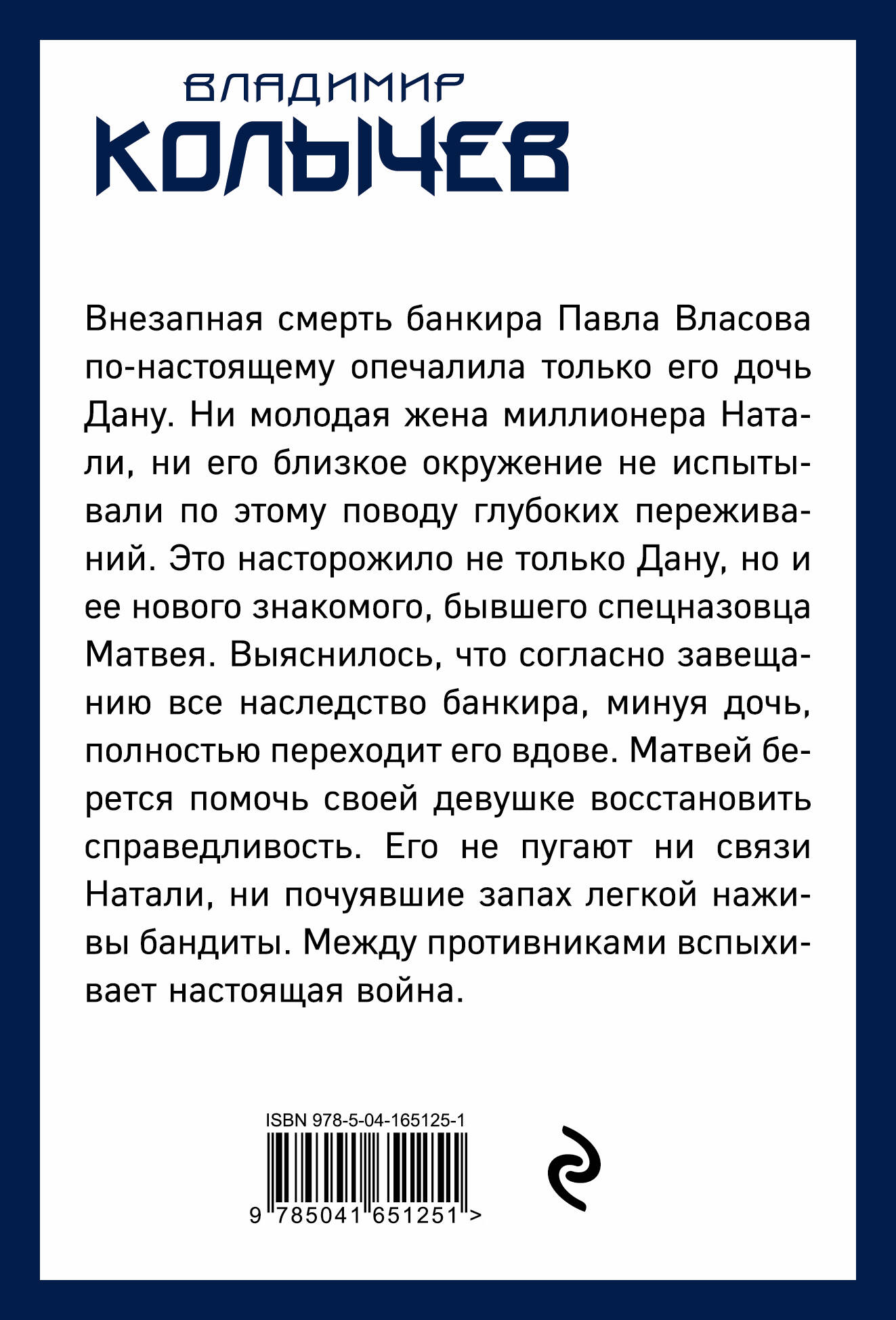 Внезапная смерть банкира Павла Власова по-настоящему опечалила только его дочь - Дану. Ни молодая жена миллионера Натали, ни его близкое окружение не испытывали по этому поводу глубоких переживаний. Это насторожило не только Дану, но и ее нового знакомого, бывшего спецназовца Матвея. Выяснилось, что согласно завещанию все наследство банкира, минуя дочь, полностью переходит его вдове. Матвей берется помочь своей девушке восстановить справедливость. Его не пугают ни связи Натали, ни почуявшие запах легкой наживы бандиты. Между противниками вспыхивает настоящая война.| Издательство | Эксмо |