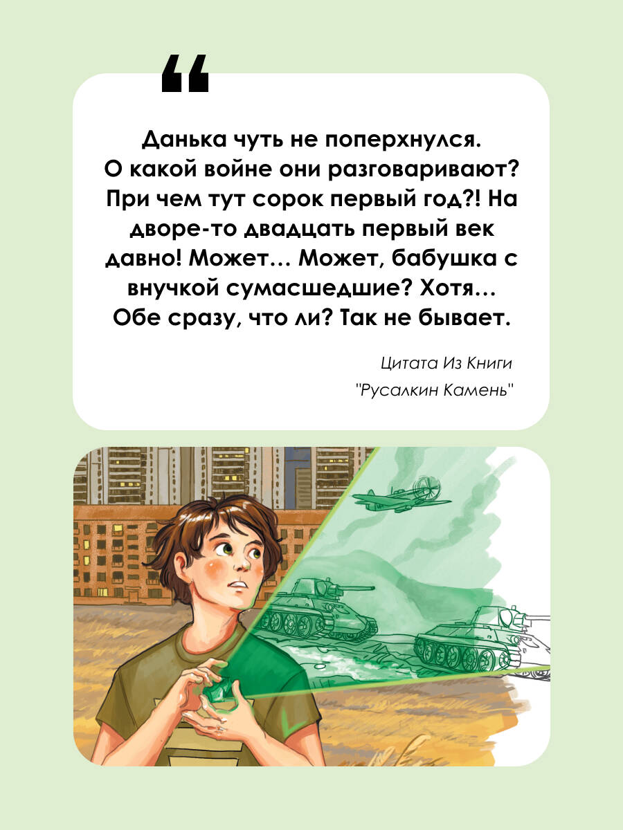 Папа у Даньки - геолог. Из экспедиций он привозит разные камни и рассказывает о них невероятные истории. Вот, например, зелененький «русалкин» камень. Он умеет исполнять желания. Конечно, Данька уже большой и не верит в сказки, но… На лето в школе задают написать рассказ о событиях Великой Отечественной войны. В очередной раз отлынивая от этого скучного занятия, Данька изо всех сил сжимает зеленый камушек в руке, и вскоре его жизнь меняется: он попадает в прошлое, в 1943 год. Сможет ли Данька приспособиться к новой реальности, где нет ни папы, ни мамы, а вокруг бушует война?| Издательство | Издательство "АСТ" |