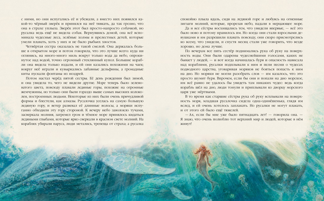 Великий сказочник Ханс Кристиан Андерсен написал эту легендарную историю на берегу моря в далёкой Дании. Юная Русалочка бесстрашно окунается в океан любви, бескрайний и опасный как сама жизнь. Её сердце полно отваги, надежды и бесконечной преданности. Свой волшебный голос и беспечную жизнь морской принцессы она готова обменять на минуты счастья рядом с любимым. Ведь только ответная любовь может подарить ей величайшие сокровища - бессмертную душу и вечную жизнь. Иллюстрации к «Русалочке» стали первым большим самостоятельным проектом замечательного петербургского художника Антона Ломаева. В 2010 году книга получила премию «Интерпресскон» в номинации лучшая иллюстрация. Прекрасная сказка с великолепными иллюстрациями станет настоящим подарком для всех, кто верит в чудо и любовь.| Издательство | Азбука |