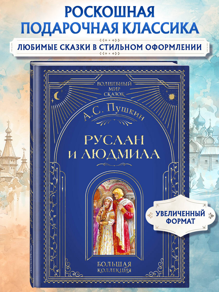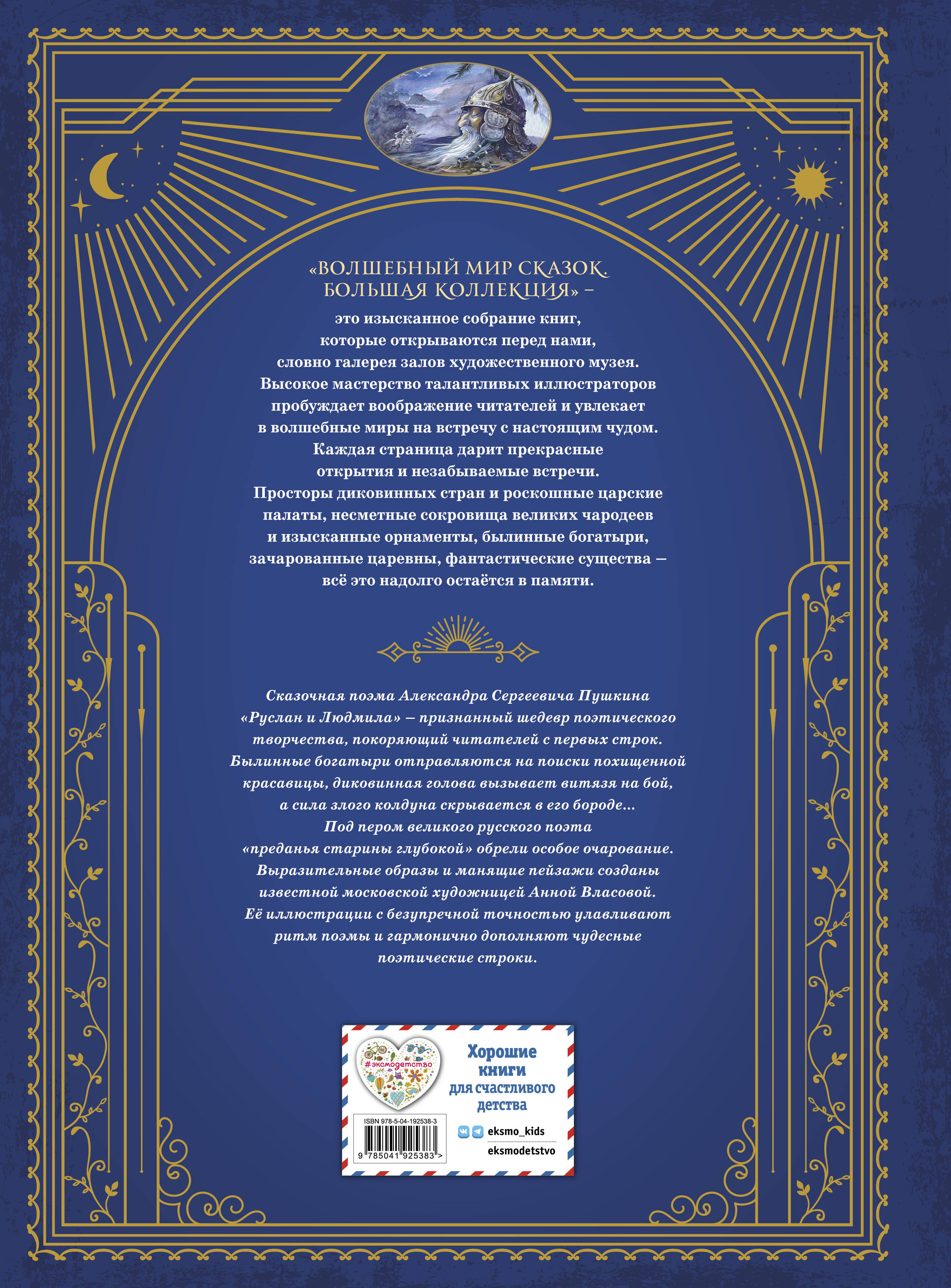 ВЕЛИКОЛЕПНОЕ ПОДАРОЧНОЕ ИЗДАНИЕ В ИЗЫСКАННОМ И СТИЛЬНОМ ОФОРМЛЕНИИ! Книга большого формата (24х32,5 см). Твёрдый переплёт с золотым тиснением и частичным лаком. Цветные форзацы. Плотная бумага. Чёткий, удобный для чтения шрифт. Красочные иллюстрации. Книги серии «Волшебный мир сказок. Большая коллекция» - это приглашение в удивительное путешествие по таинственным мирам, ставшим зримыми и осязаемыми благодаря искусству художников. Лучшие мастера книжной иллюстрации подарят вам незабываемые впечатления от встречи со сказкой. На мистических и прекрасных просторах Древней Руси разворачивается действие знаменитой пушкинской поэмы «Руслан и Людмила». Погрузиться в незабываемую атмосферу читателям помогут изысканные, стилистически точные, красочные иллюстрации известной московской художницы Анны Власовой. С незапамятных времён люди придумывали необыкновенные страны, населяли их чудесными существами и рассказывали диковинные истории об удивительных событиях, происходивших «в некотором царстве, в некотором государстве». Так появились сказки, без которых сегодня мы не можем представить детство. Волшебные или очень похожие на правду, страшные или смешные, народные или литературные - все они увлекали слушателей своей необычностью, загадочностью, передавали от предков и закладывали в сердца бесценные сокровища: вековую мудрость, понимание добра и зла, неписаные правила жизни, - и так формировали уникальный культурный код наций и народов.| Издательство | ООО "Издательство "Эксмо" |