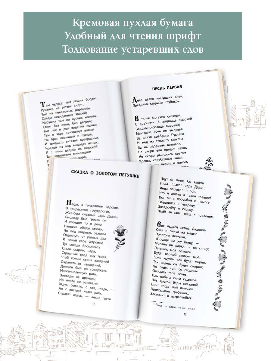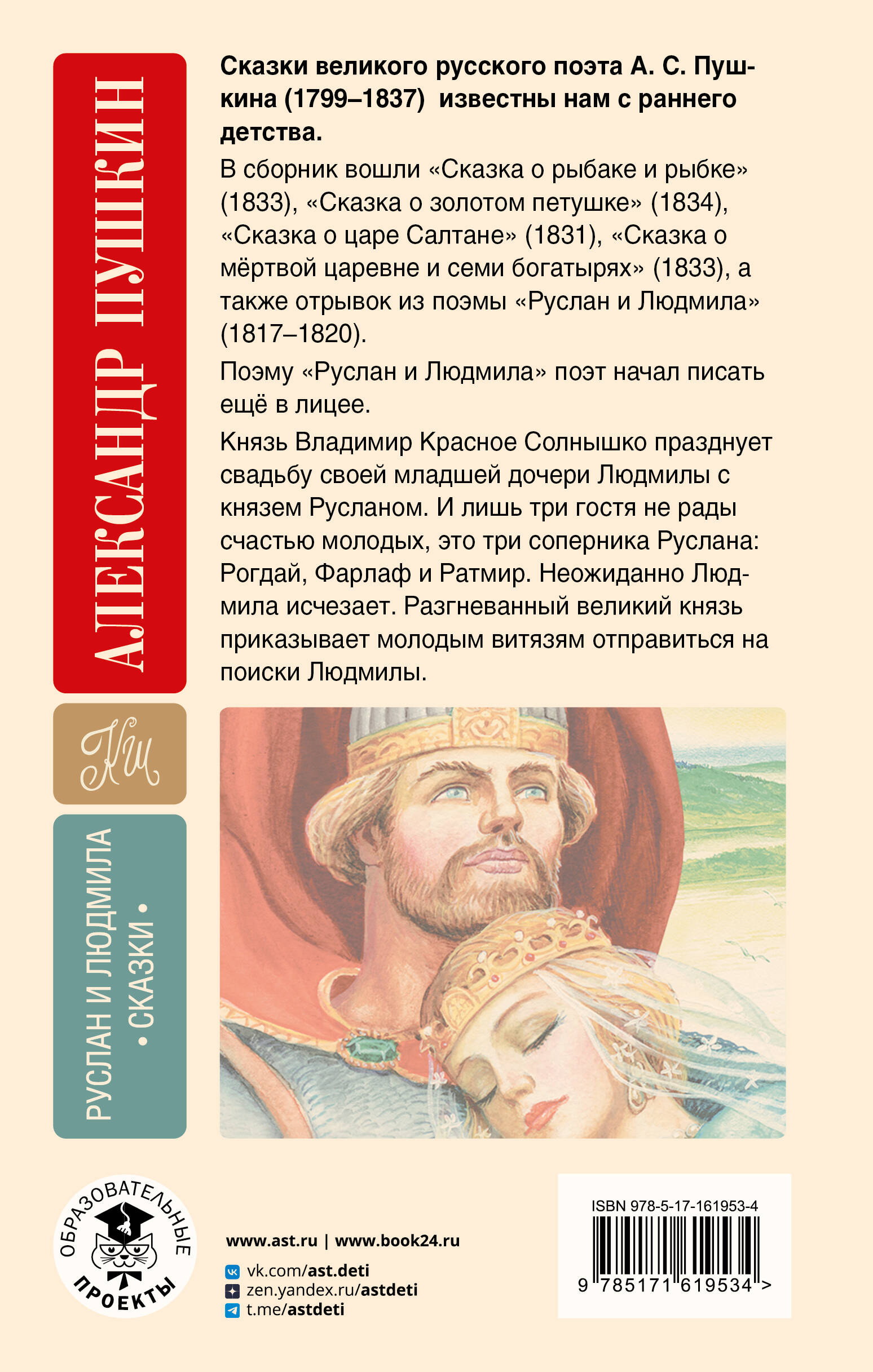 Сказки великого русского поэта А.С. Пушкина (1799-1837) известны нам с раннего детства. В сборник вошли "Сказка о рыбаке и рыбке" (1833), "Сказка о золотом петушке" (1834), "Сказка о царе Салтане" (1831), "Сказка о мёртвой царевне и семи богатырях" (1833), а также отрывок из поэмы "Руслан и Людмила" (1817-1820). Поэму "Руслан и Людмила" поэт начал писать ещё в лицее. Князь Владимир Красное Солнышко празднует свадьбу своей младшей дочери Людмилы с князем Русланом. И лишь три гостя не рады счастью молодых, это три соперника Руслана: Рогдай, Фарлаф и Ратмир. Неожиданно Людмила исчезает. Разгневанный великий книзь приказывает молодым витязям отправиться на поиски Людмилы.