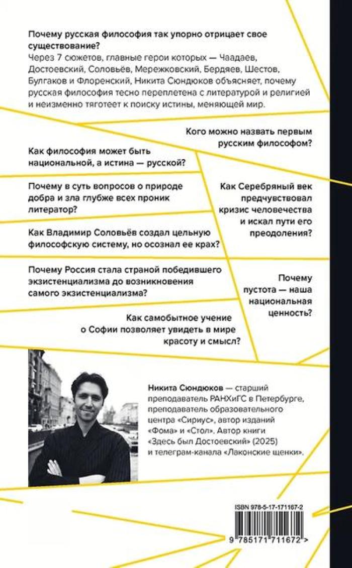 Через 7 сюжетов, главные герои которых - Чаадаев, Достоевский, Соловьёв, Мережковский, Бердяев, Шестов, Булгаков и Флоренский, Никита Сюндюков объясняет, почему русская философия тесно переплетена с литературой и религией и неизменно тяготеет к поиску истины, меняющей мир. • Кого можно назвать первым русским философом? • Почему в суть вопросов о природе добра и зла глубже всех проник литератор? • Как Владимир Соловьёв создал цельную философскую систему, но осознал ее крах? • Как Серебряный век предчувствовал кризис человечества и искал пути его преодоления? • Почему Россия стала страной победившего экзистенциализма до возникновения самого экзистенциализма? • Как самобытное учение о Софии позволяет увидеть в мире красоту и смысл? • Почему пустота - наша национальная ценность? Никита Сюндюков - старший преподаватель РАНХиГС в Петербурге, преподаватель образовательного центра «Сириус», автор изданий «Фома» и «Стол». Автор книги «Здесь был Достоевский» (2025) и телеграм-канала «Лаконские щенки». Предисловие Андрея Тесли.| Издательство | АСТ |