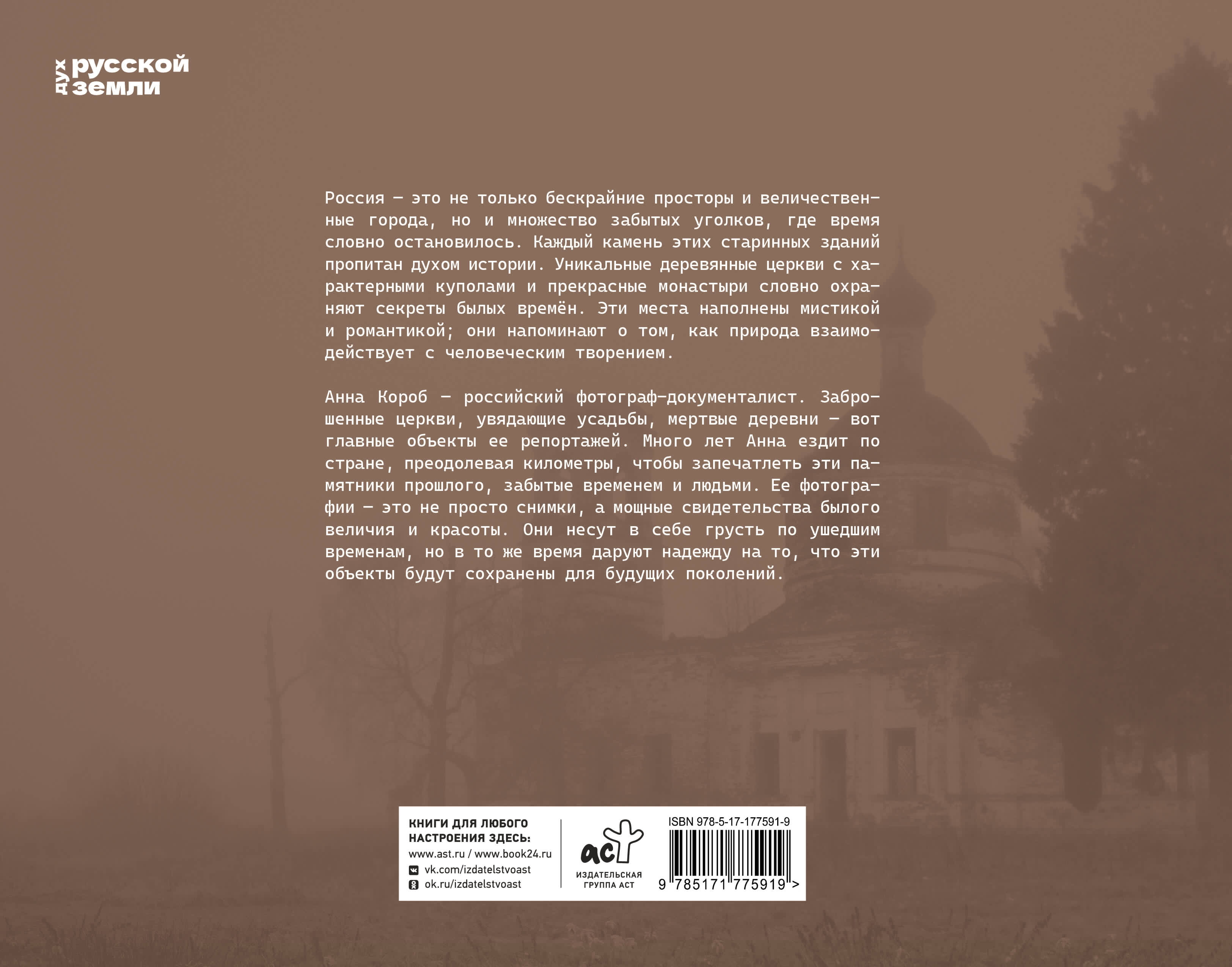 Россия - это не только бескрайние просторы и величественные города, но и множество забытых уголков, где время словно остановилось. Каждый камень этих старинных зданий пропитан духом истории. Уникальные деревянные церкви с характерными куполами и прекрасные монастыри словно охраняют секреты былых времён. Эти места наполнены мистикой и романтикой; они напоминают о том, как природа взаимодействует с человеческим творением. Анна Короб - российский фотограф-документалист. Заброшенные церкви, увядающие усадьбы, мертвые деревни - вот главные объекты ее репортажей. Много лет Анна ездит по стране, преодолевая километры, чтобы запечатлеть эти памятники прошлого, забытые временем и людьми. Ее фотографии - это не просто снимки, а мощные свидетельства былого величия и красоты. Они несут в себе грусть по ушедшим временам, но в то же время даруют надежду на то, что эти объекты будут сохранены для будущих поколений.| Издательство | Издательство "АСТ" |