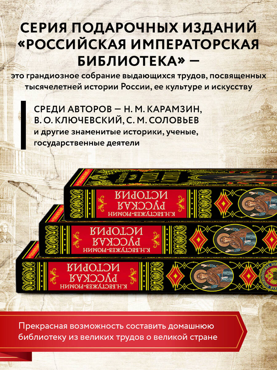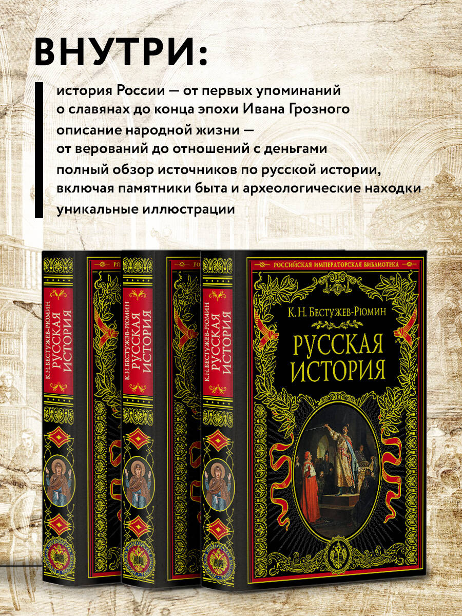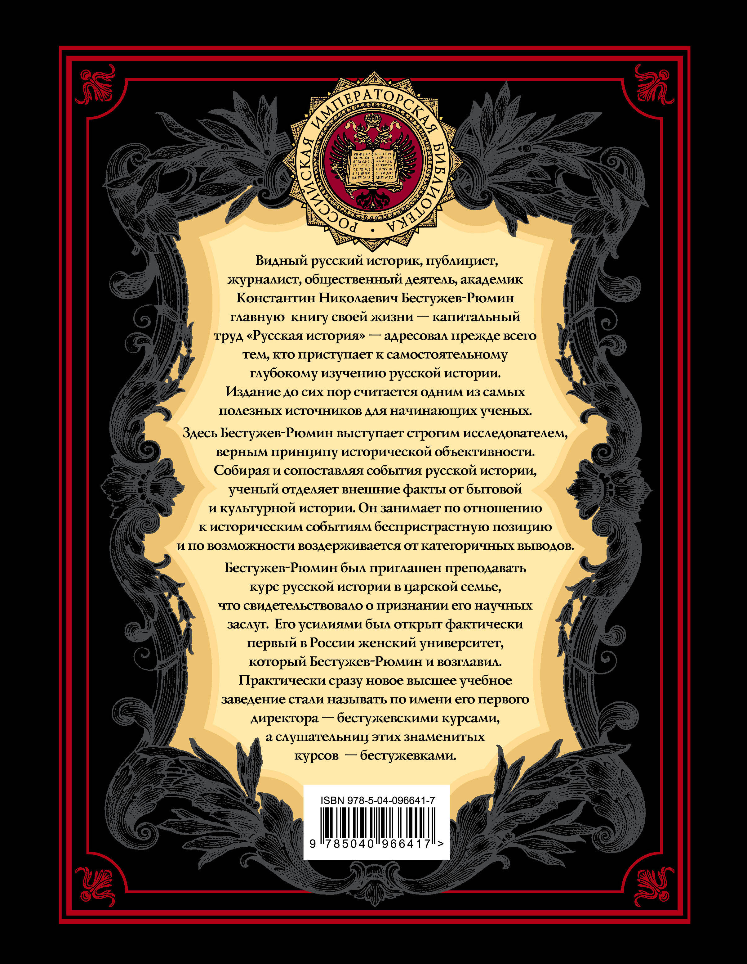 Главным вкладом в науку видного русского историка, публициста, журналиста, академика Константина Николаевича Бестужева-Рюмина (1827-1897) считается капитальный труд «Русская история». В нем он выступает строгим исследователем, верным принципу исторической объективности. Собирая и сопоставляя события русской истории, К. Н. Бестужев-Рюмин отделяет внешние факты от истории бытовой и истории культурной; ученый занимает по отношению к историческим событиям спокойную и беспристрастную позицию и по возможности воздерживается от категоричных выводов. С особенным вниманием он останавливается на формах семейной, общественной, государственной, религиозной и литературной жизни, указывает важнейшие исторические труды, сопоставляет разные мнения по каждому вопросу. Свою книгу автор прежде всего адресовал тем, кто приступает к самостоятельному глубокому изучению русской истории. Издание на долгое время стало полезным справочником для начинающих исследователей, актуально оно и в наше время. Серия «Российская императорская библиотека» - это грандиозное собрание выдающихся образцов отечественной мысли и словесности. Издания, вошедшие в серию, представляют собой лучшее в великом духовном наследии нашей страны. Это труды, созданные знаменитыми историками, учеными, великими государственными деятелями и посвященные тысячелетней истории России, ее культуре и искусству, военной славе, многовековым народным обычаям и деяниям выдающихся представителей нашего Отечества. Прекрасная возможность составить свою домашнюю библиотеку из великих трудов о великой стране. Каждая книга серии прекрасно проиллюстрирована многочисленными цветными и черно-белыми иллюстрациями, которые дают возможность в полном объеме увидеть то, что составляет сокровищницу культурного наследия нашей страны!| Издательство | ООО "Издательство "Эксмо" |