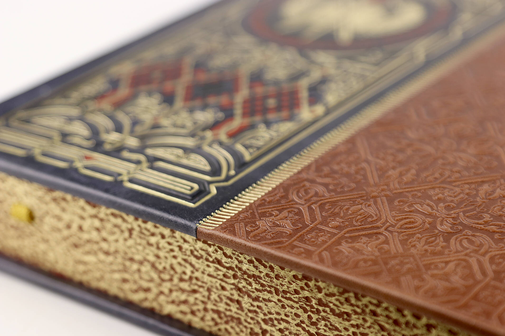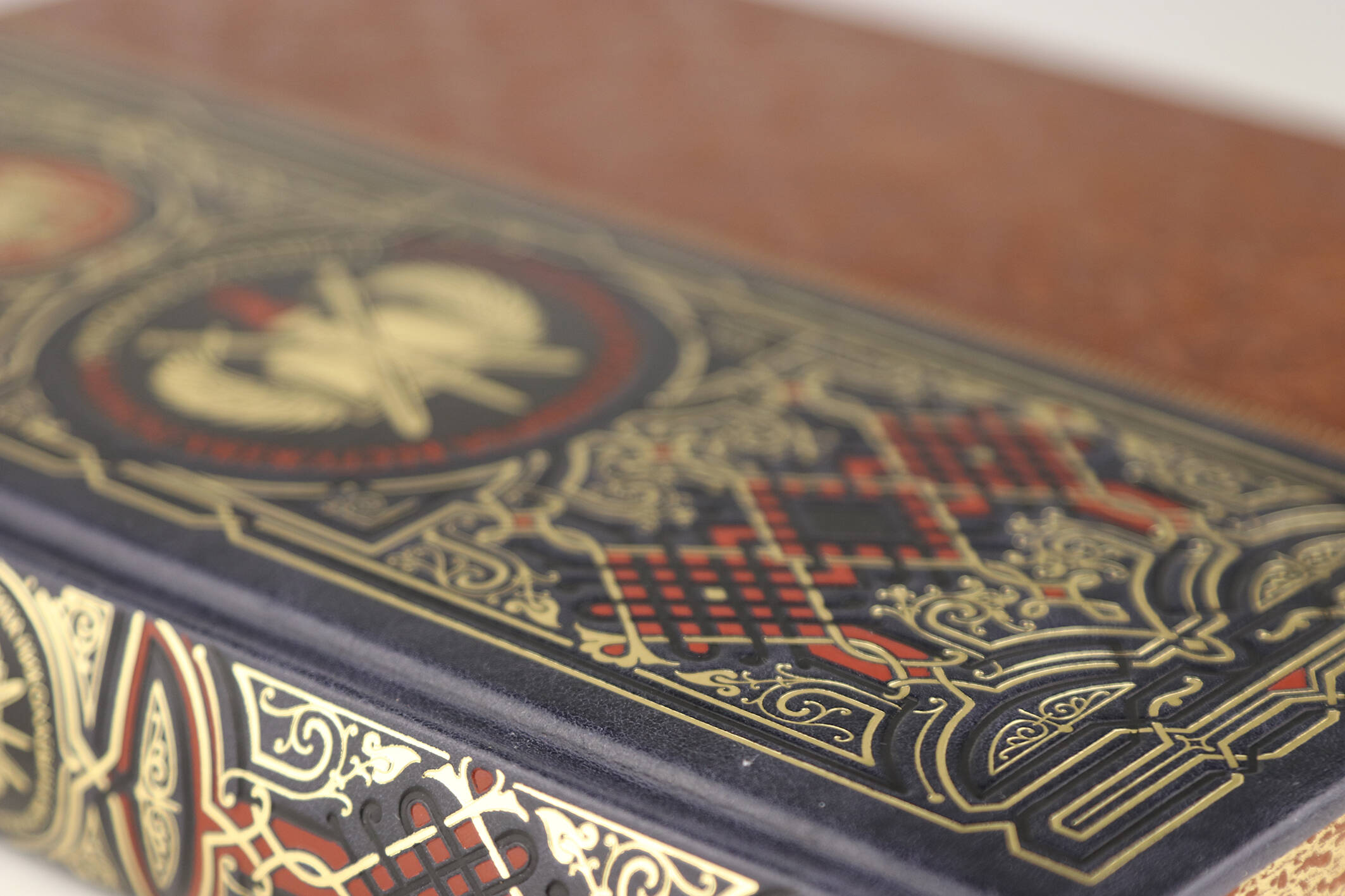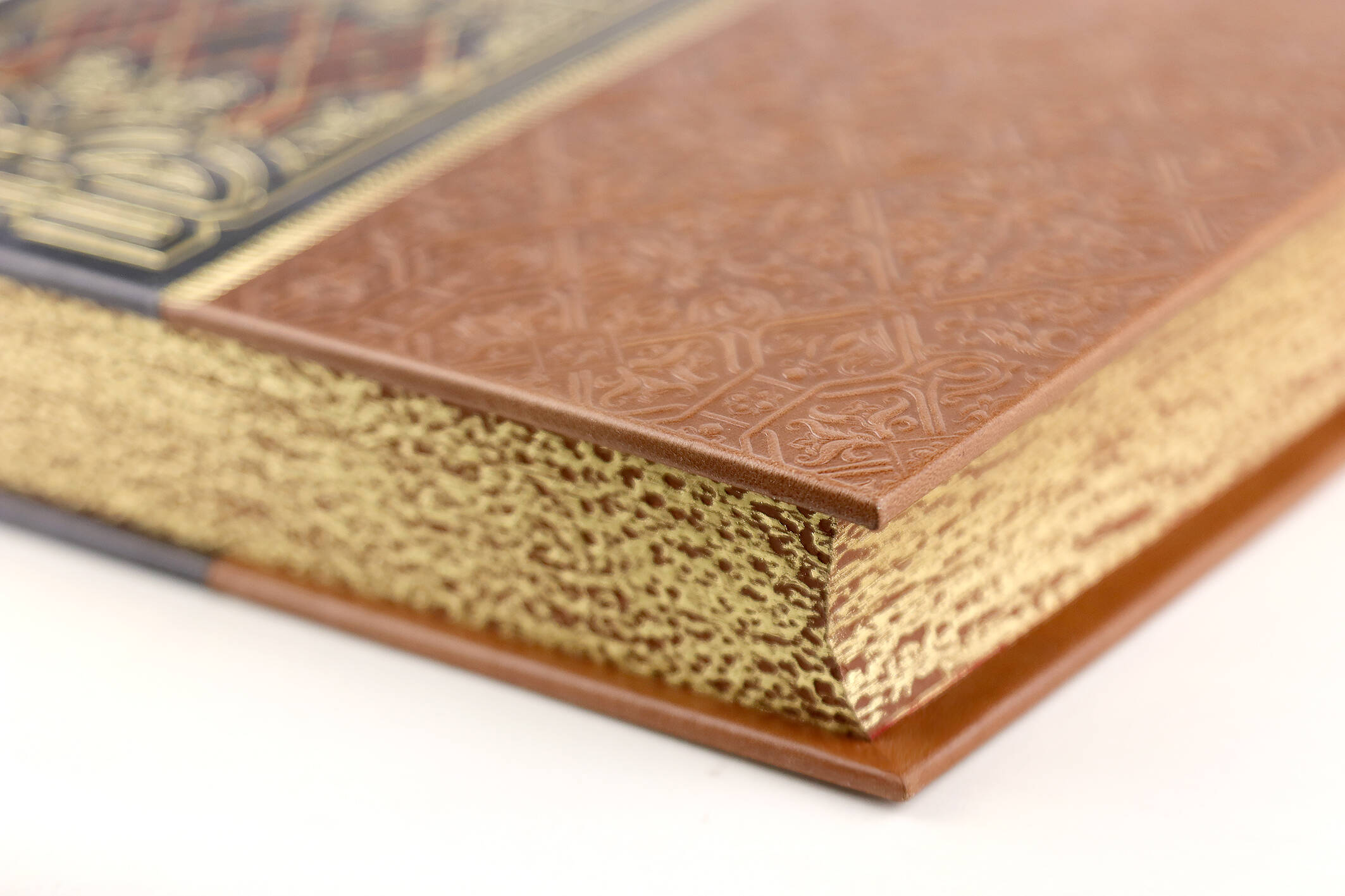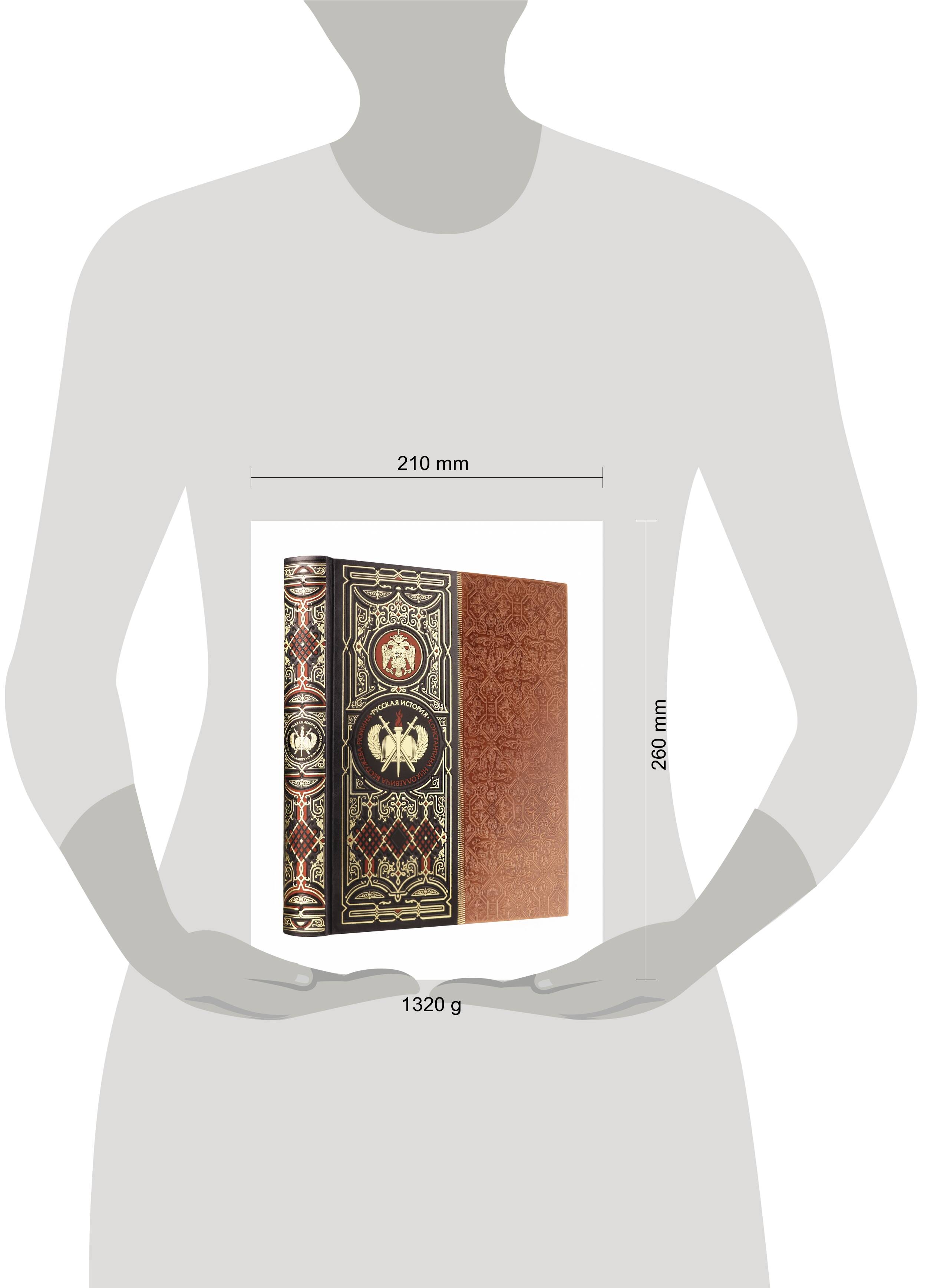 Книга в коллекционном инкрустированном переплёте. Переплет изготовлен их двух видов натуральной кожи по технологии 19 века и украшен сплошным тончайшим тиснением, в полном соответствии с лучшими образцами переплетов европейских мастеров. Использовано 3 вида тиснения - золото,черный натуральный пигмент и рельефное тиснение. В оформлении переплета использованы универсальные растительно-геометрические плетёные орнаменты, благодаря им книга будет отлично смотреться на любой книжной полке. Лента для закладывания страниц и каптал, скрепляющий верх и низ объемного тома, изготовлены из шелка. Бумага в книге легкая, матовая, что обеспечивает комфортное чтение даже длительное время, иллюстрации напечатаны на высокобелой мелованной бумаге. Обрез книги вызолочен вручную. К книге прилагается красочный сертификат, подтверждающий уникальность издания, он вложен в каждый экземпляр и пронумерован.