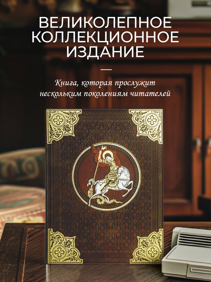 Книга в коллекционном переплете, изготовленном из натуральной гладкой кожи, украшенном тончайшим тиснением в русском стиле. На передней сторонке изображен св. Георгий Победоносец, поражающий змия, на корешке использован рукописный шрифт. Книга отпечатана на белой бумаге с легкой текстурой. Более 150-ти редких графических иллюстраций в тексте. Цветные иллюстрации отпечатаны на специальных листах из высокобелой мелованной бумаги, вшитых в книгу. 4 вида тиснения - золото, серебро, красный натуральный пигмент и рельефное тиснение. Форзацы из дизайнерской тонированной бумаги. Обрез окрашен в цвет переплета, торшонирован и вызолочен вручную. Лента для закладывания страниц и каптал, скрепляющий верх и низ объемного тома, изготовлены из шелка. К книге прилагается красочный сертификат, подтверждающий уникальность издания, он вложен в каждый экземпляр и пронумерован вручную.| Издательство | ООО "Издательство "Эксмо" |