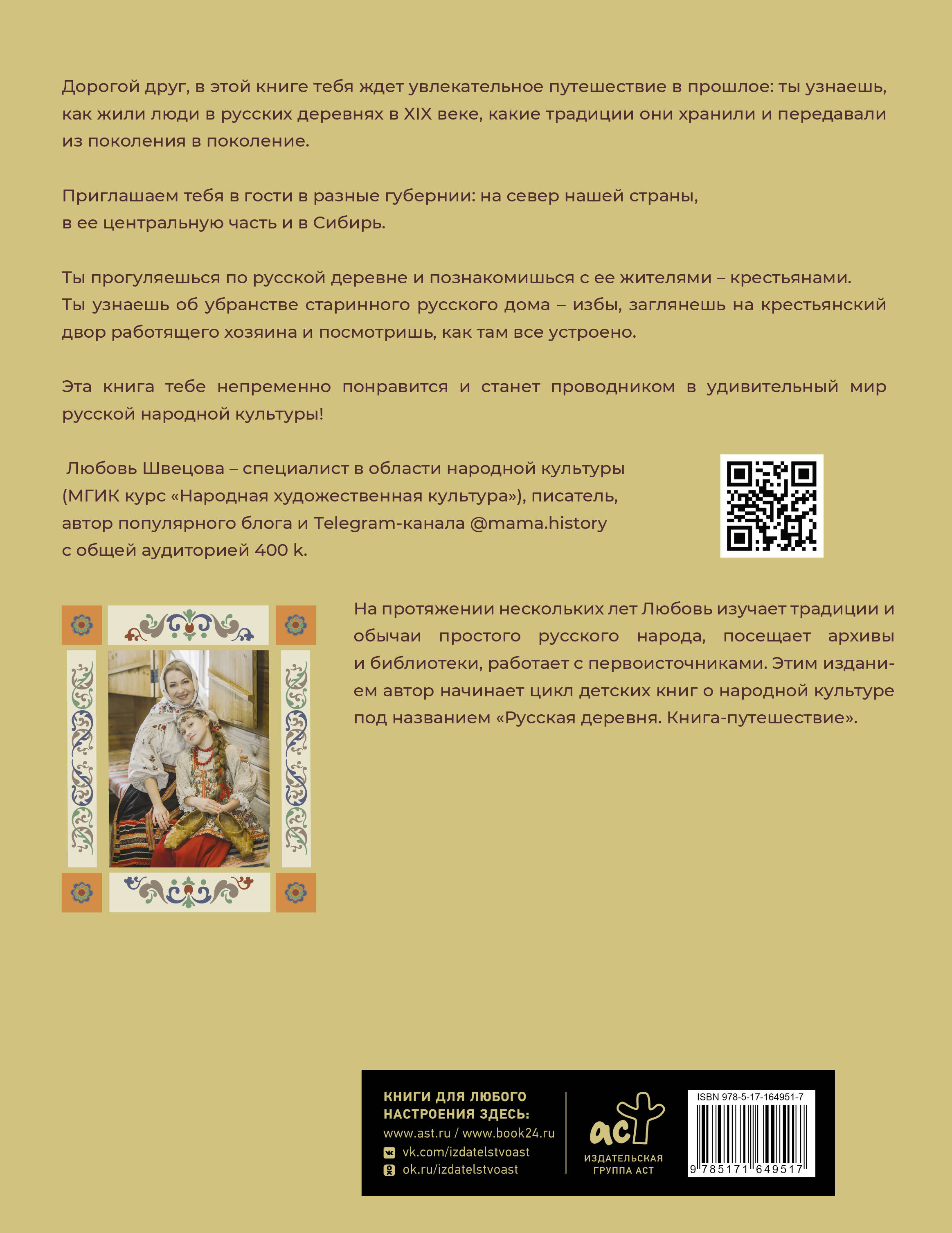 Дорогой друг, в этой книге тебя ждет увлекательное путешествие в прошлое: ты узнаешь, как жили люди в русских деревнях в XIX веке, какие традиции они хранили и передавали из поколения в поколение. Приглашаем тебя в гости в разные губернии: на север нашей страны, в ее центральную часть и в Сибирь. Ты прогуляешься по русской деревне и познакомишься с ее жителями - крестьянами. Ты узнаешь об убранстве старинного русского дома - избы, заглянешь на крестьянский двор работящего хозяина и посмотришь, как там все устроено. Эта книга тебе непременно понравится и станет проводником в удивительный мир русской народной культуры! Любовь Швецова - специалист в области народной культуры (МГИК, курс "Народная художественная культура"), писатель, автор популярного блога и Telegram-канала @mama.history с общей аудиторией 400 k. На протяжении нескольких лет Любовь изучает традиции и обычаи простого русского народа, посещает архивы и библиотеки, работает с первоисточниками. Этим изданием автор начинает серию детских книг о народной культуре под названием "Русская деревня. Книга-путешествие".