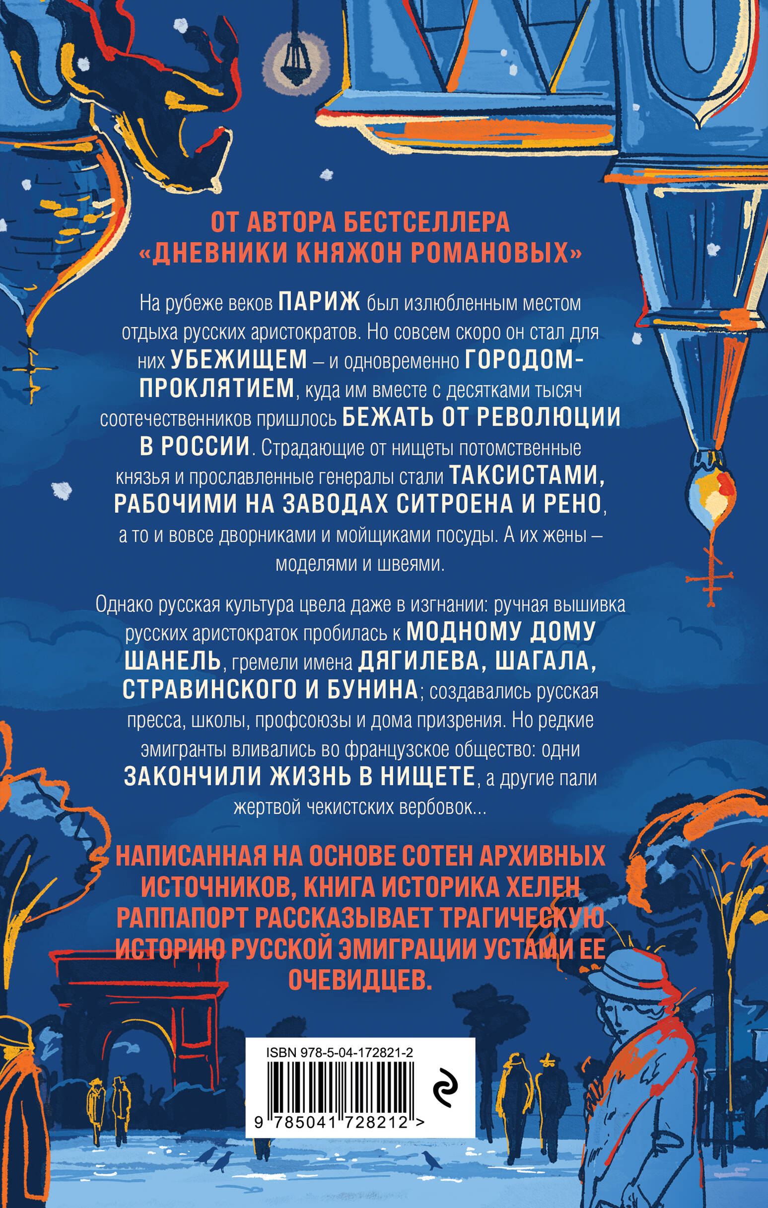 ОТ АВТОРА БЕСТСЕЛЛЕРА «ДНЕВНИКИ КНЯЖОН РОМАНОВЫХ». УВЛЕКАТЕЛЬНЫЕ И ТРАГИЧНЫЕ ИСТОРИИ РУССКИХ ЭМИГРАНТОВ ВО ФРАНЦИИ - УСТАМИ ЕЕ ОЧЕВИДЦЕВ. На рубеже веков Париж был излюбленным местом отдыха русских аристократов, тративших в местных ресторанах и кабаре баснословные суммы. Но всего через пару десятилетий он стал убежищем для десятков тысяч русских, - и одновременно городом-проклятием, где они страдали от нищеты и тоски по России. Потомственные князья и прославленные генералы становились таксистами, рабочими на заводах Ситроена и Рено, а то и вовсе дворниками и мойщиками посуды. А их жены - моделями и швеями. Несмотря на все тяготы, русская культура цвела даже в Париже - ручная вышивка талантливых аристократок нашла свою дорогу к модному дому Шанель, на целое десятилетие введя в моду «русский стиль». Гремели имена Дягилева, Шагала, Стравинского и Бунина; создавалась русская пресса, школы, профсоюзы и дома призрения. Но далеко не всем эмигрантам удавалось влиться во французское общество: одни закончили жизнь в нищете, а некоторые пали жертвой чекистских вербовок... Написанная на основе сотен архивных источников, книга историка Хелен Раппапорт - это красочный репортаж из прошлого, рассказывающий трагическую историю русской эмиграции устами ее очевидцев. ----------------------------- «Занимательно, а временами - душераздирающе... Раппапорт, плодовитый историк и уважаемый эксперт по династии Романовых, рисует Париж, в котором русские долгое время играли заметную роль». - Wall Street Journal «На каждой странице Хелен Раппапорт, непревзойденный историк, демонстрирует свое глубокое исследование эпохи, города и его жителей. Яркое в культурном отношении исследование русской эмиграции, покинувшей родную страну в неспокойное время». - Kirkus Review «Полная красочных историй и колоритных персонажей, эта книга о жизни в изгнании очень интересна». - Publishers Weekly| Издательство | ООО "Издательство "Эксмо" |