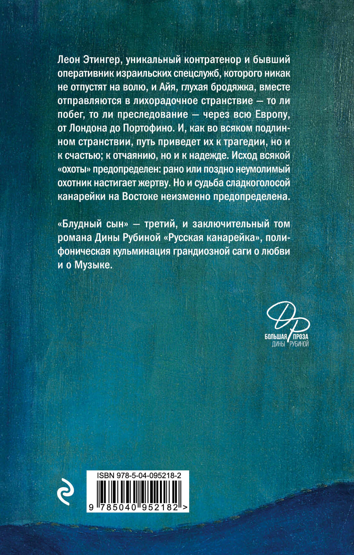 Леон Этингер, уникальный контратенор и бывший оперативник израильских спецслужб, которого никак не отпустят на волю, и Айя, глухая бродяжка, вместе отправляются в лихорадочное странствие - то ли побег, то ли преследование - через всю Европу, от Лондона до Портофино. И, как во всяком подлинном странствии, путь приведет их к трагедии, но и к счастью; к отчаянию, но и к надежде. Исход всякой "охоты" предопределен: рано или поздно неумолимый охотник настигает жертву. Но и судьба сладкоголосой канарейки на Востоке неизменно предопределена. "Блудный сын" - третий и заключительный том романа Дины Рубиной "Русская канарейка", полифоническая кульминация грандиозной саги о любви и о Музыке.| Издательство | ООО "Издательство "Эксмо" |
