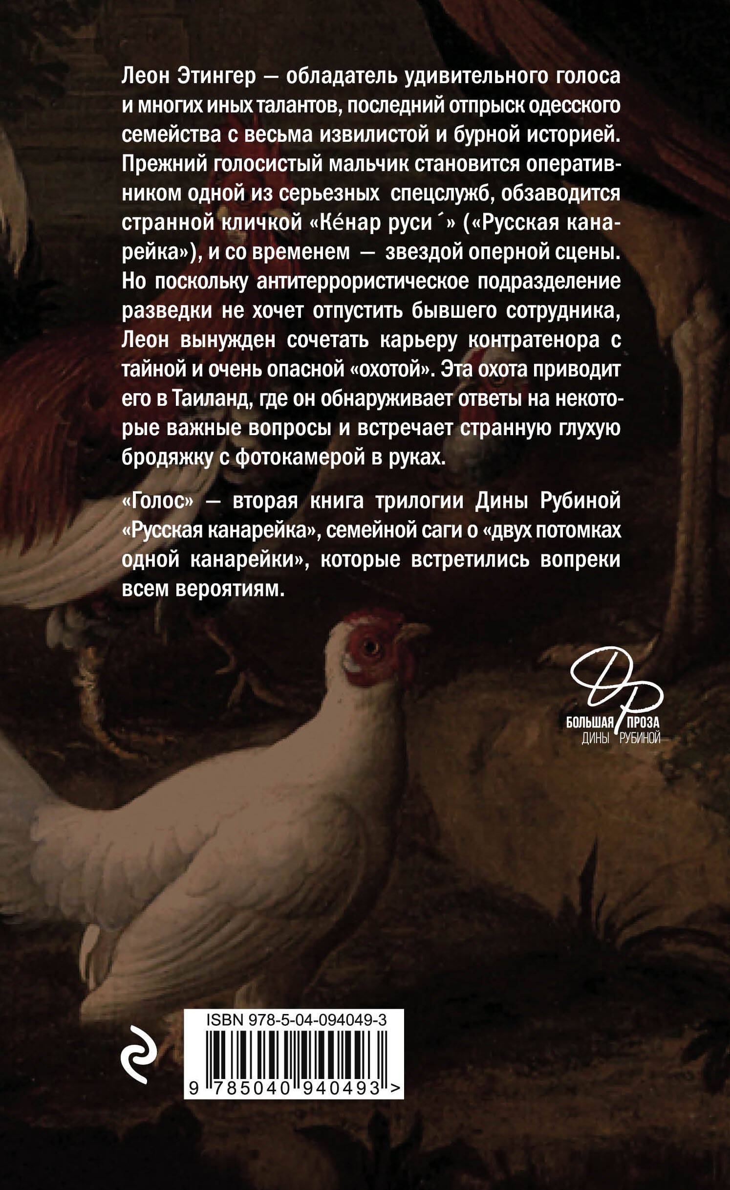 Леон Этингер - обладатель удивительного голоса и многих иных талантов, последний отпрыск одесского семейства с весьма извилистой и бурной историей. Прежний голосистый мальчик становится оперативником одной из серьезных спецслужб, обзаводится странной кличкой "Кéнар русиˆ", ("Русская канарейка"), и со временем - звездой оперной сцены. Но поскольку антитеррористическое подразделение разведки не хочет отпустить бывшего сотрудника, Леон вынужден сочетать карьеру контратенора с тайной и очень опасной "охотой". Эта охота приводит его в Таиланд, где он обнаруживает ответы на некоторые важные вопросы и встречает странную глухую бродяжку с фотокамерой в руках. "Голос" - вторая книга трилогии Дины Рубиной "Русская канарейка", семейной саги о "двух потомках одной канарейки", которые встретились вопреки всем вероятиям.| Издательство | ООО "Издательство "Эксмо" |