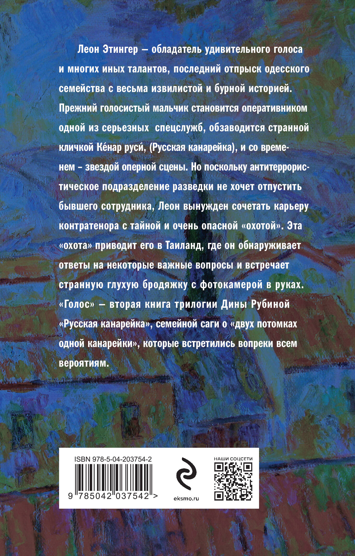 Леон Этингер - обладатель удивительного голоса и многих иных талантов, последний отпрыск одесского семейства с весьма извилистой и бурной историей. Прежний голосистый мальчик становится оперативником одной из серьезных спецслужб, где обзаводится странной кличкой «Кéнар руси´» (Русская канарейка), а со временем превращается в звезду оперной сцены. Но поскольку антитеррористическое подразделение разведки не хочет отпустить бывшего сотрудника, Леон вынужден сочетать карьеру контратенора с тайной и очень опасной «охотой». Эта охота приводит его в Таиланд, где он обнаруживает ответы на некоторые важные вопросы и встречает странную глухую бродяжку с фотокамерой в руках. «Голос» - вторая книга трилогии Дины Рубиной «Русская канарейка», семейной саги о «двух потомках одной канарейки», которые встретились вопреки всем вероятиям.| Издательство | ООО "Издательство "Эксмо" |