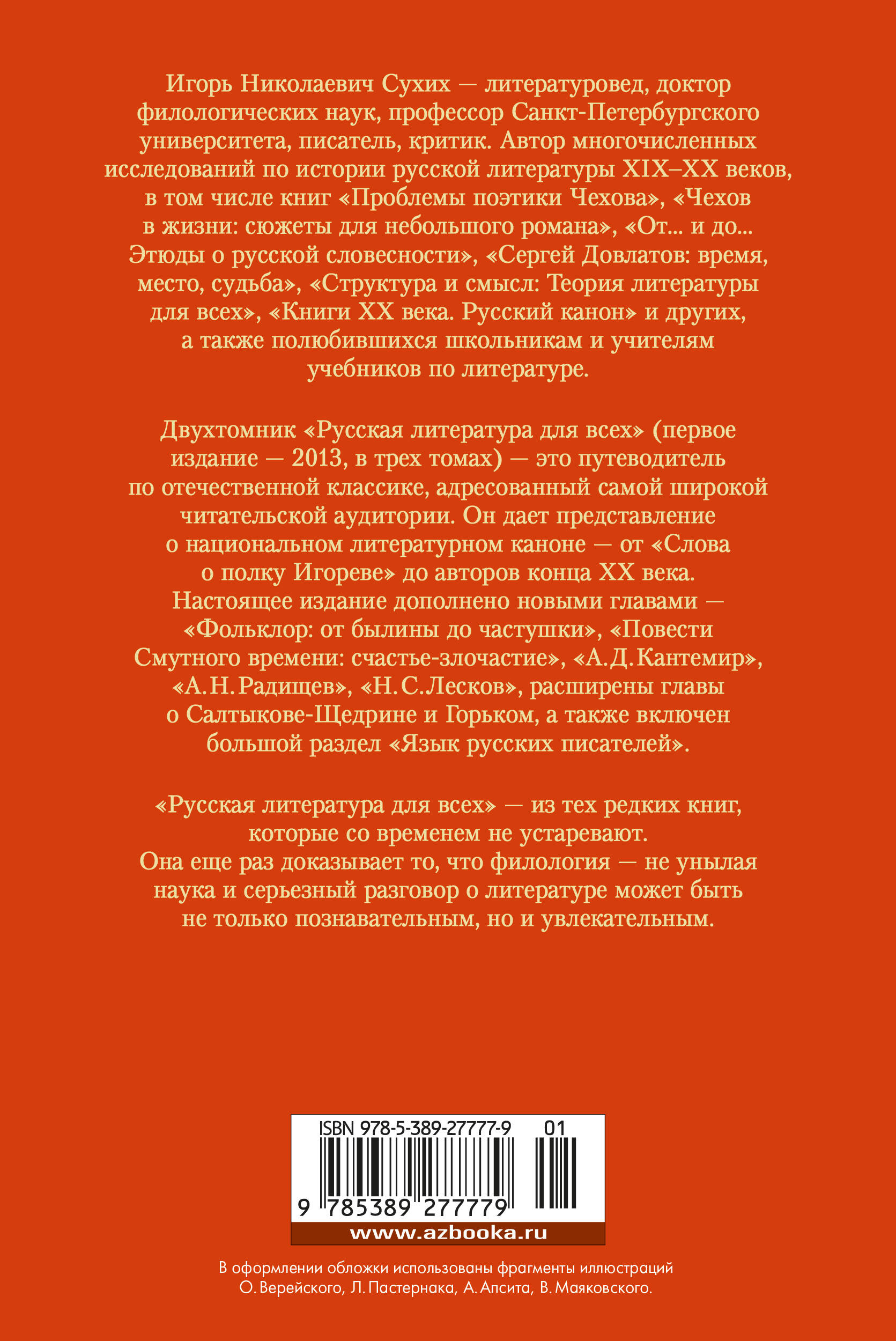 Игорь Николаевич Сухих - литературовед, доктор филологических наук, профессор Санкт-Петербургского университета, писатель, критик. Автор многочисленных исследований по истории русской литературы XIX-XX веков, в том числе книг "Проблемы поэтики Чехова", "Чехов в жизни: сюжеты для небольшого романа", "От… и до… Этюды о русской словесности", "Сергей Довлатов: время, место, судьба", "Структура и смысл: Теория литературы для всех", "Книги ХХ века. Русский канон" и других, а также полюбившихся школьникам и учителям учебников по литературе. Двухтомник "Русская литература для всех" (первое издание - 2013, в трех томах) - это путеводитель по отечественной классике, адресованный самой широкой читательской аудитории. Он дает представление о национальном литературном каноне - от "Слова о полку Игореве" до авторов конца ХХ века. Настоящее издание дополнено новыми главами - "Фольклор: от былины до частушки", "Повести Смутного времени: счастье-злочастие", "А. Д. Кантемир", "А. Н. Радищев", "Н. С. Лесков", расширены главы о Салтыкове-Щедрине и Горьком, а также включен большой раздел "Язык русских писателей". "Русская литература для всех" - из тех редких книг, которые со временем не устаревают. Она еще раз доказывает то, что филология - не унылая наука и серьезный разговор о литературе может быть не только познавательным, но и увлекательным.| Издательство | Азбука-Аттикус Издат.группа ООО |