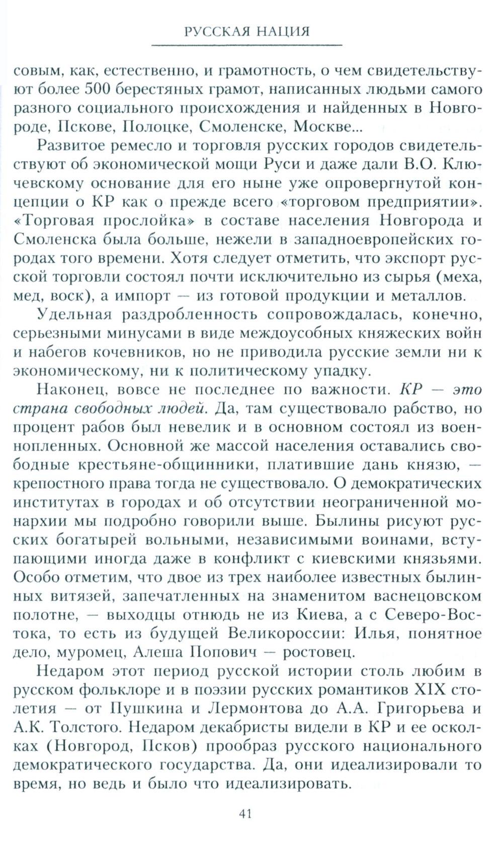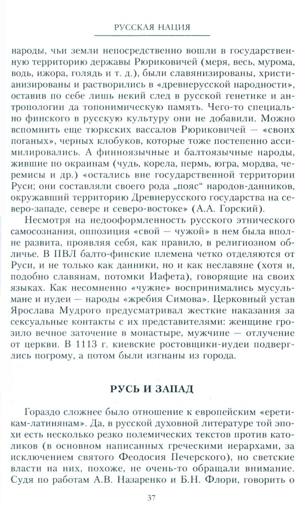 Предлагаемая книга, ставшая завершением многолетних исследований автора, не является очередной историей России. Это именно история русской нации. Поэтому читателю, думающему почерпнуть здесь элементарные сведения об отечественном прошлом, лучше обратиться к другим работам, благо их множество. Судя по электронному каталогу Российской государственной библиотеки, на русском языке не существует ни одной книги с названием «история русской нации». На первый взгляд это кажется досадной нелепостью, очередной грустной иллюстрацией к пушкинскому: «Мы ленивы и нелюбопытны». На самом же деле за этим фактом стоит сама логика русской истории. Ибо вовсе не случайно отечественная историография предпочитает описывать историю государства Российского, а не историю русского народа.| Издательство | Центрполиграф |
