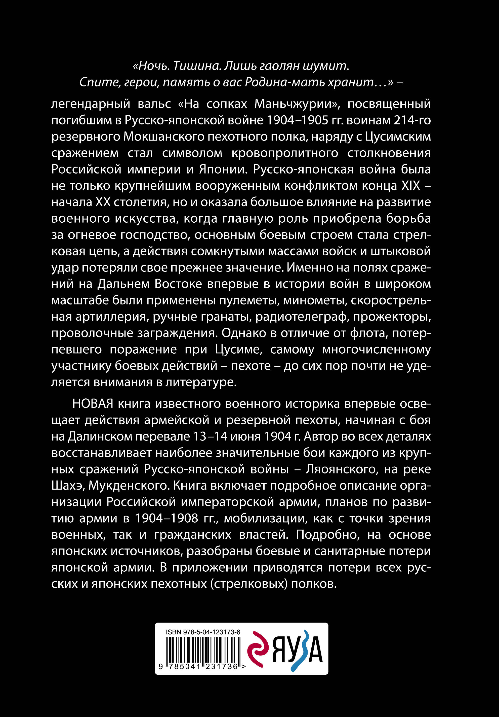 «Ночь. Тишина. Лишь гаолян шумит. Спите, герои, память о вас Родина-мать хранит…» - легендарный вальс «На сопках Маньчжурии», посвященный погибшим в Русско-японской войне 1904-1905 гг. воинам 214-го резервного Мокшанского пехотного полка, наряду с Цусимским сражением стал символом кровопролитного столкновения Российской Империи и Японии. Русско-японская война была не только крупнейшим вооруженным конфликт конца XIX - начала ХХ столетий, но и оказала большое влияние на развитие военного искусства, когда главную роль приобрела борьба за огневое господство, основным боевым строем стала стрелковая цепь, а действия сомкнутыми массами войск и штыковой удар потеряли свое прежнее значение. Именно на полях сражений на Дальнем Востоке впервые в истории войн в широком масштабе были применены пулеметы, минометы, скорострельная артиллерия, ручные гранаты, радиотелеграф, прожекторы, проволочные заграждения. Однако, в отличие от флота, потерпевшего поражение при Цусиме, самому многочисленному участнику боевых действий - пехоте до сих пор почти не уделяется внимания в литературе. НОВАЯ книга известного военного историка впервые освещает действия армейской и резервной пехоты, начиная с боя на Далинском перевале 13-14 июня 1904 г. Автор во всех деталях восстанавливает наиболее значительные бои каждого из крупных сражений Русско-японской войны - Ляоянского, на реке Шахэ, Мукденского. Книга включает подробное описание организации Российской императорской армии, планов по развитию армии в 1904-1908 гг., мобилизации, как с точки зрения военных, так и гражданских властей. Подробно, на основе японских источников, разобраны боевые и санитарные потери японской армии. В приложении приводятся потери всех русских и японских пехотных (стрелковых) полков.| Издательство | ООО "Издательство "Эксмо" |