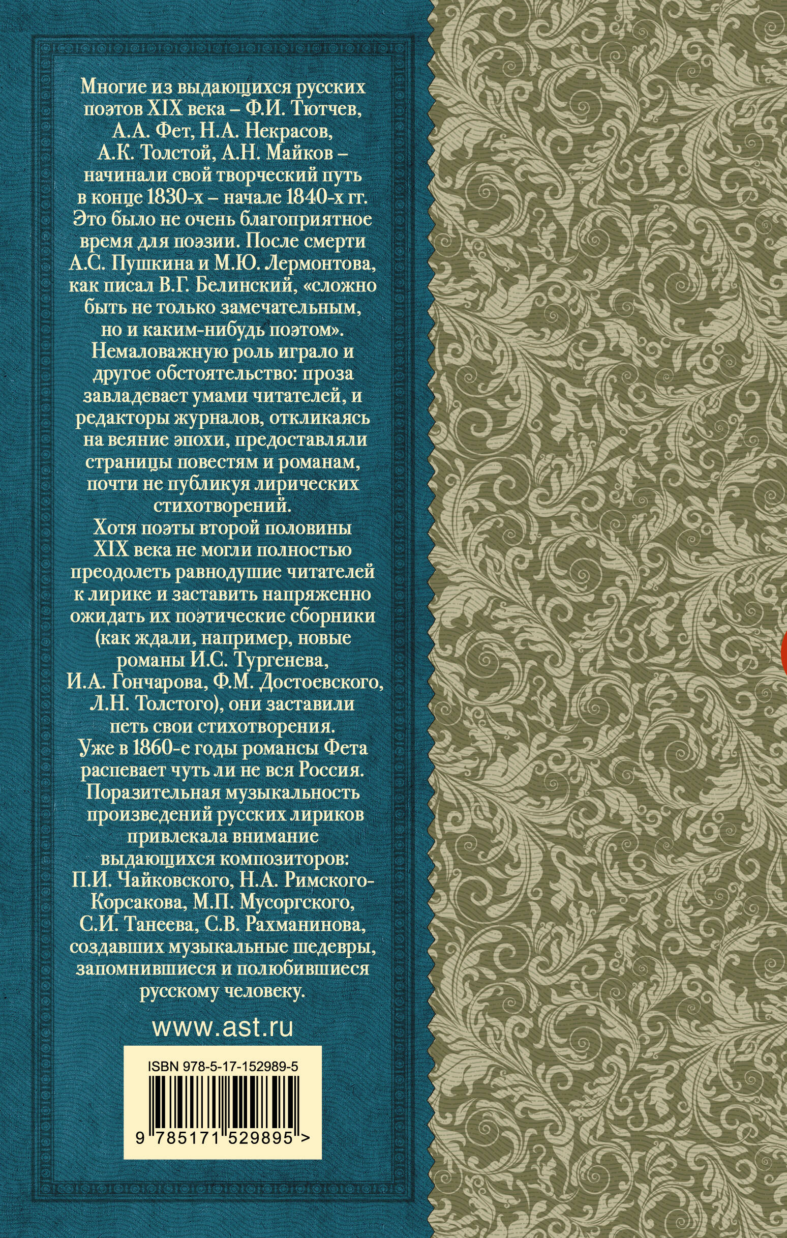 Многие из выдающихся русских поэтов XIX века - Ф.И. Тютчев,А.А. Фет, Н.А. Некрасов, А.К. Толстой, А.Н. Майков - начинали свой творческий путь в конце 1830-х - начале 1840-х гг. Это было не очень благоприятное время для поэзии. После смерти А.С. Пушкина и М.Ю. Лермонтова, как писал В.Г. Белинский, "сложно быть не только замечательным,но и каким-нибудь поэтом". Немаловажную роль играло и другое обстоятельство: проза завладевает умами читателей, и редакторы журналов, откликаясь на веяние эпохи, предоставляли страницы повестям и романам, почти не публикуя лирических стихотворений. Хотя поэты второй половины XIX века не могли полностью преодолеть равнодушие читателей к лирике и заставить напряженно ожидать их поэтические сборники (как ждали, например, новые романы И.С. Тургенева, И.А. Гончарова, Ф.М. Достоевского,Л.Н. Толстого), они заставили петь свои стихотворения. Уже в 1860-е годы романсы Фета распевает чуть ли не вся Россия. Поразительная музыкальность произведений русских лириков привлекала внимание выдающихся композиторов: П.И. Чайковского, Н.А. Римского- Корсакова, М.П. Мусоргского, С.И. Танеева, С.В. Рахманинова, создавших музыкальные шедевры, запомнившиеся и полюбившиеся русскому человеку.| Издательство | ИЗДАТЕЛЬСТВО "АСТ" |