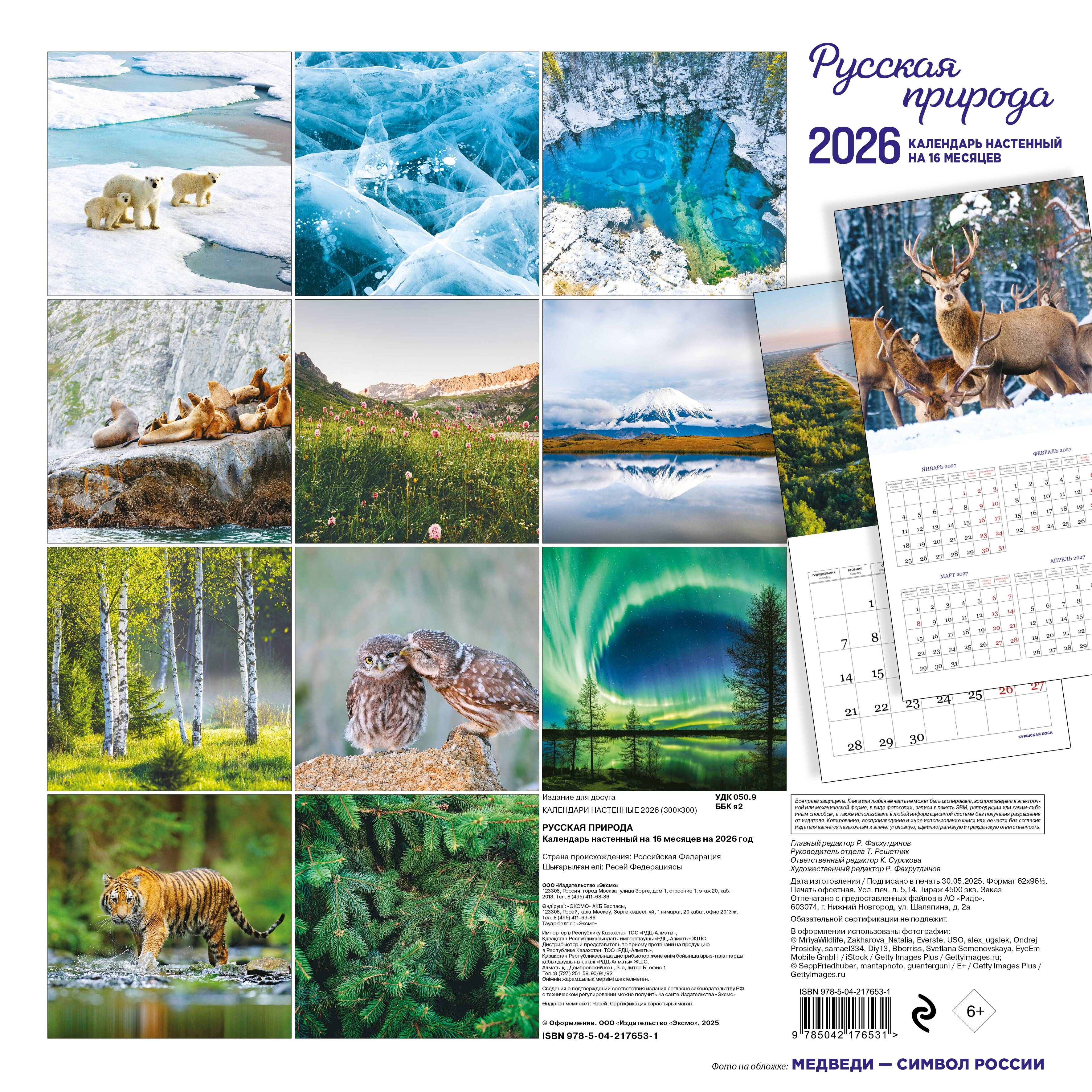 О серии: Наши настенные календари отличаются высоким качеством исполнения! Тщательно подобранные иллюстрации, напечатанные на глянцевой бумаге высочайшего качества, станут настоящим украшением дома, а в календарной сетке найдется место для ваших планов: большие клетки позволят делать записи и организовать свой год! В календаре также отмечены все государственные праздники. В серии настенных календарей издательства «ЭКСМО» каждый найдет тему по вкусу: великие художники, великолепные подборки с самыми знаменитыми произведениями искусства, легендарные кинематографические саги и игры, главные книжные авторы и бестселлеры, фотографии и иллюстрации любимых животных и многое-многое другое! О календаре: Красочный календарь с вдохновляющими фотографиями русской природы в зимних, весенних, летних и осенних пейзажах! Практичный и эстетичный, этот календарь каждый месяц будет радовать вас новыми красотами России, и, конечно, он органично впишется в любой интерьер. Для кого: Красочные фотографии помогут насладиться красотой русской природы. Технические параметры: - Тип календаря - настенный перекидной. - Год - 2026. - Календарная сетка - с разбивкой по месяцам. - Вид скрепления - скрепка. - Ширина - 30 см. - Высота - 30 см. - Внутренний блок - мелованная бумага 115 г/м2. - Подложка - плотный гофрокартон для поддержания формы. - Индивидуальная упаковка в плотный целлофановый пакет.| Издательство | ООО "Издательство "Эксмо" |